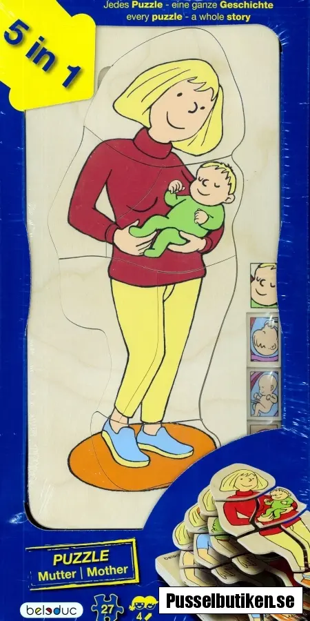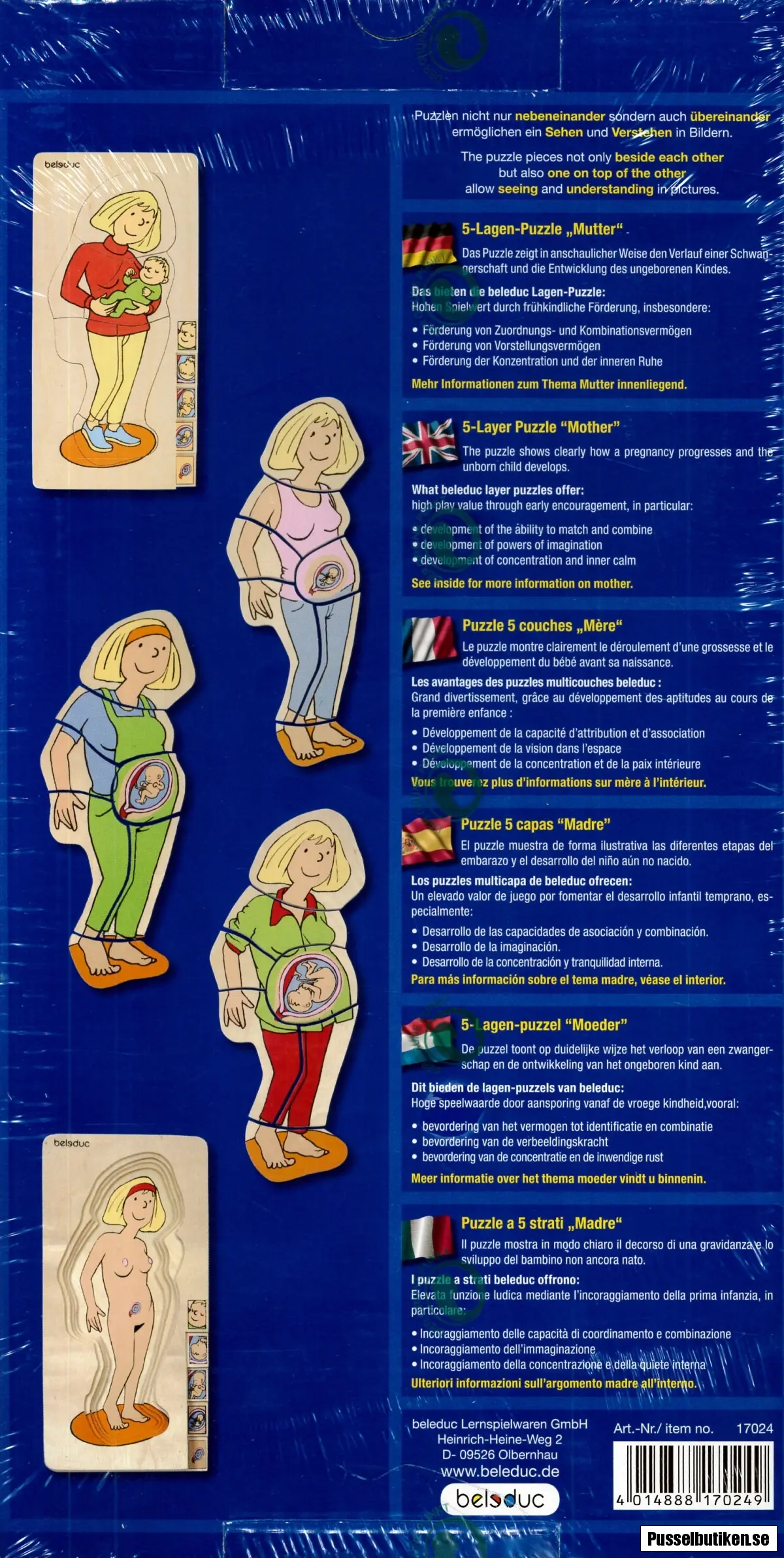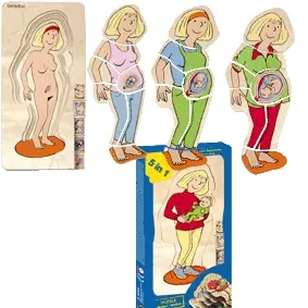 Pedagogiskt rampussel i trä, med fyra pussel i ett. Pusslet hjälper dig att förstå hur kroppen fungerar när en kvinna är gravid och ska få ett barn. Bakgrundsbilden visar en gravid kvinna i ett tidigt stadium av graviditeten. Du kan sedan lägga pusslet i lager på lager för att se hur fostret växer, för att till slut se en bild på mamman tillsammans med sin bebis.