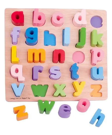 Träpussel med det engelska alfabetet i färgglada bitar, observera att Å, Ä och Ö inte ingår!