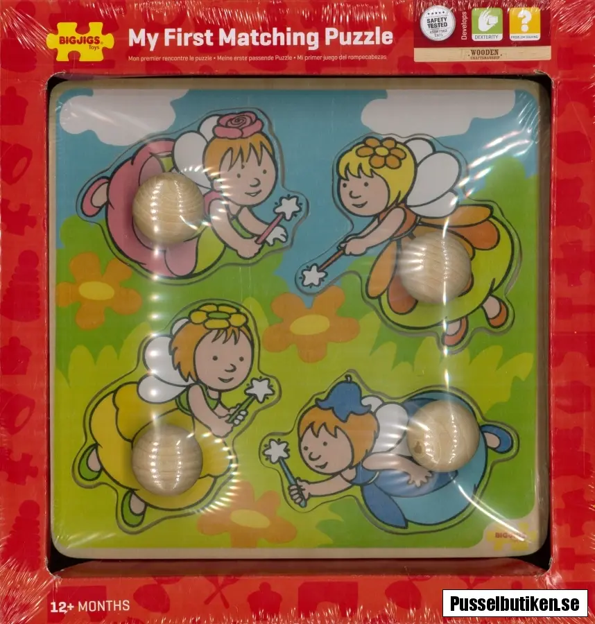 Knoppussel i trä med fyra bitar. Motivet visar en grön blomsteräng där du ska placera ut fyra små blomsterfeer. I detta knoppussel är även knopparna gjorda av trä och mycket greppvänliga.