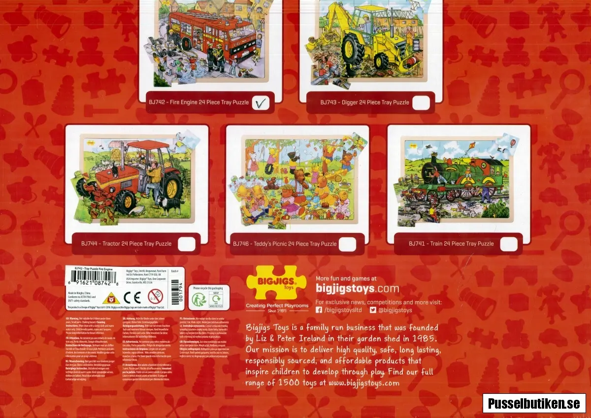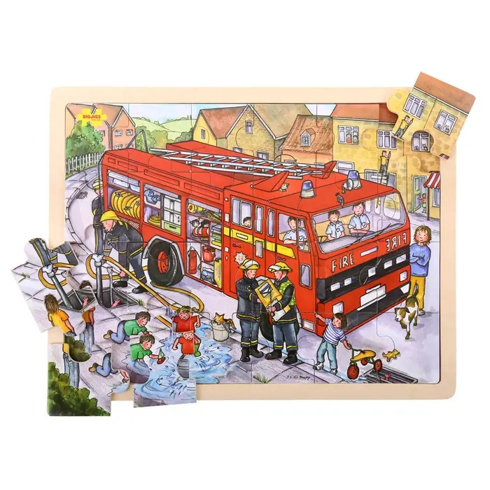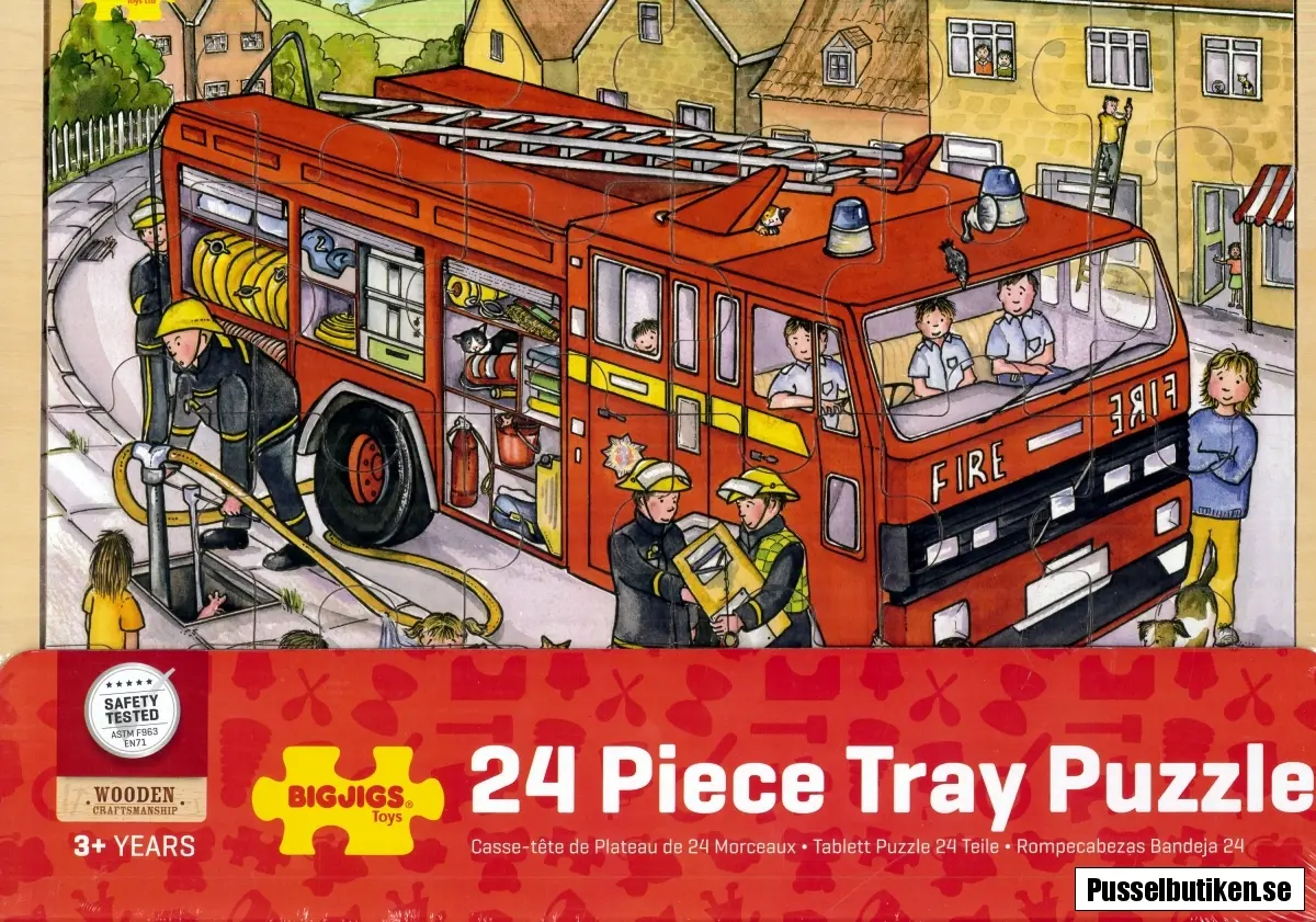 Rampussel i trä med 24 stora pusselbitar. Motivet visar en brandbil med utrustning och brandmän vid en vattenpost. På trottoaren leker barnen i vattnet.