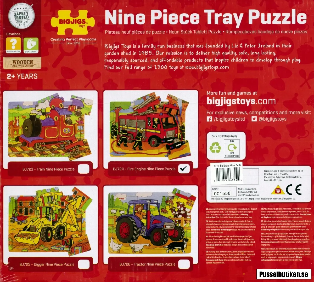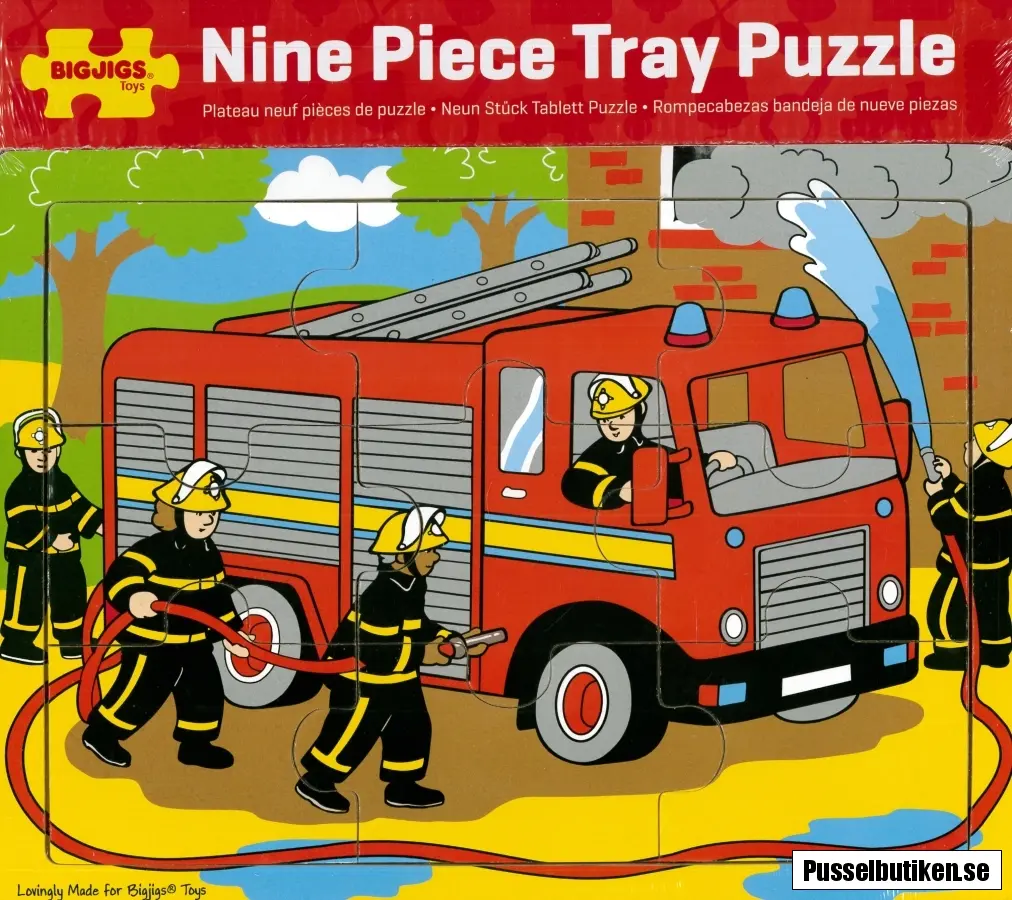 Rampussel i trä med nio stora bitar. Motivet visar en brandbil och hur några brandmän släcker en eld. Bilden sträcker sig fint över pusslets träram, och syns även bakom pusselbitarna så att man lättare kan se var varje bit ska ligga.