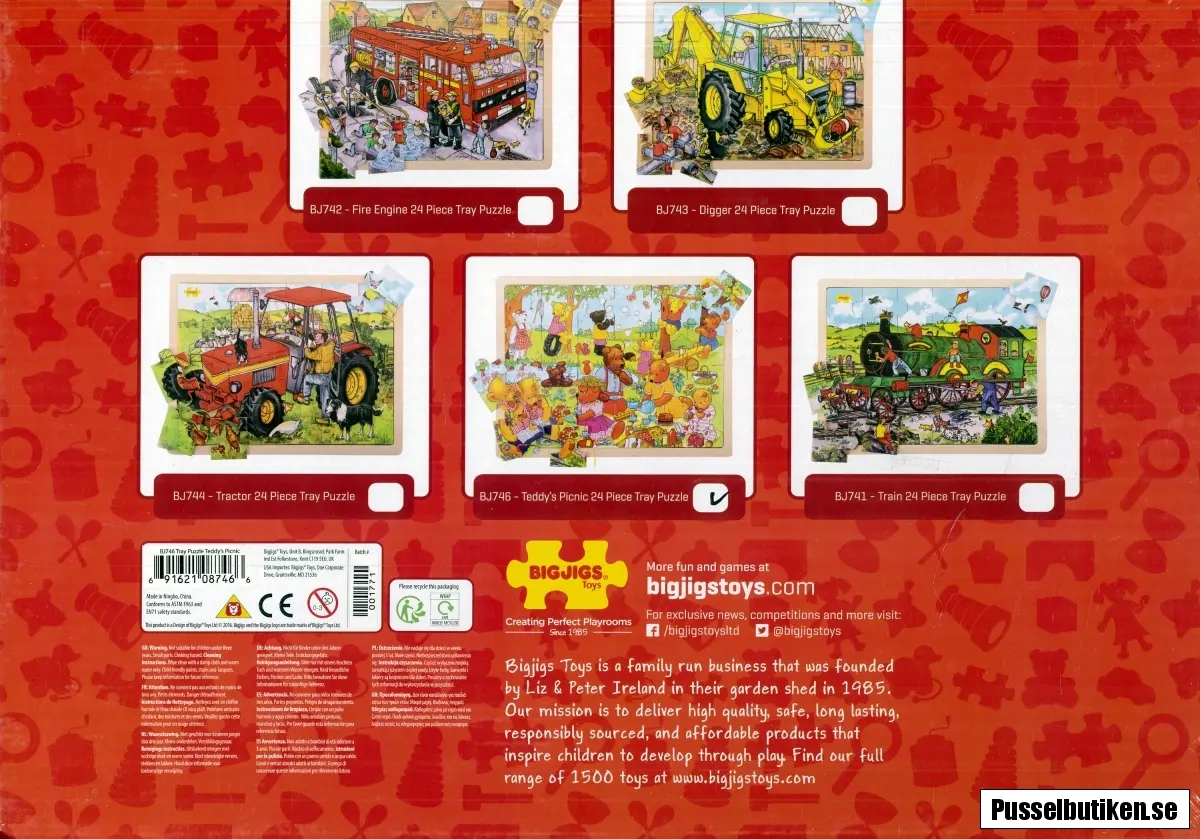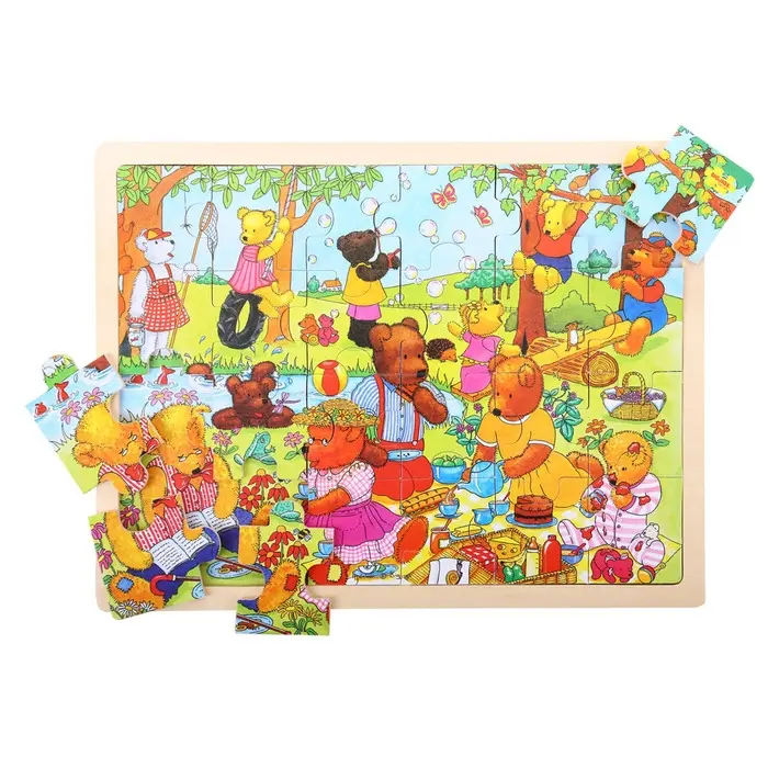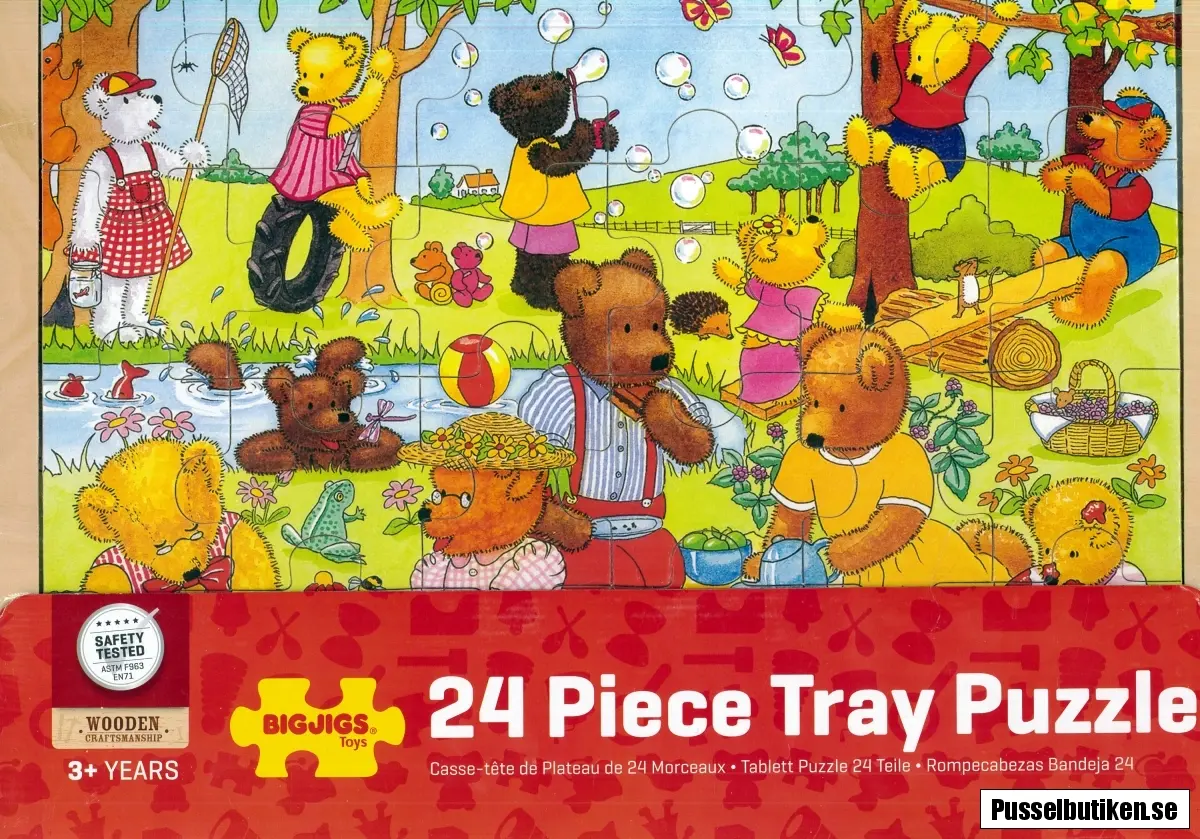 Rampussel i trä med 24 stora bitar. Bilden är färgglad, detaljrik och lekfull. Teddybjörnarna har picknick i parken och har precis packat upp massor av godsaker ur picknickkorgen. Några björnar läser medan andra leker vid dammen, gungar gungbräda och är på upptäcktsfärd bland träden.