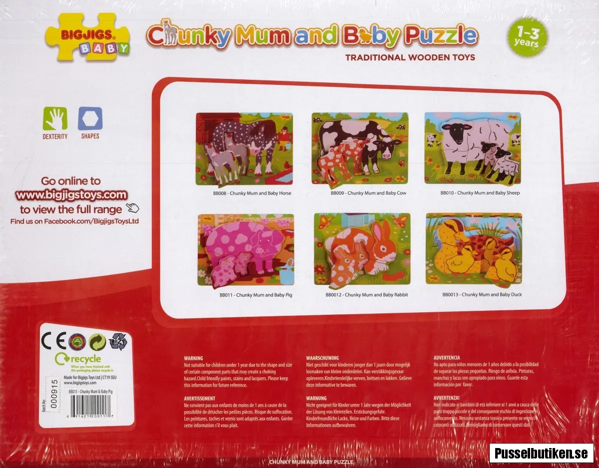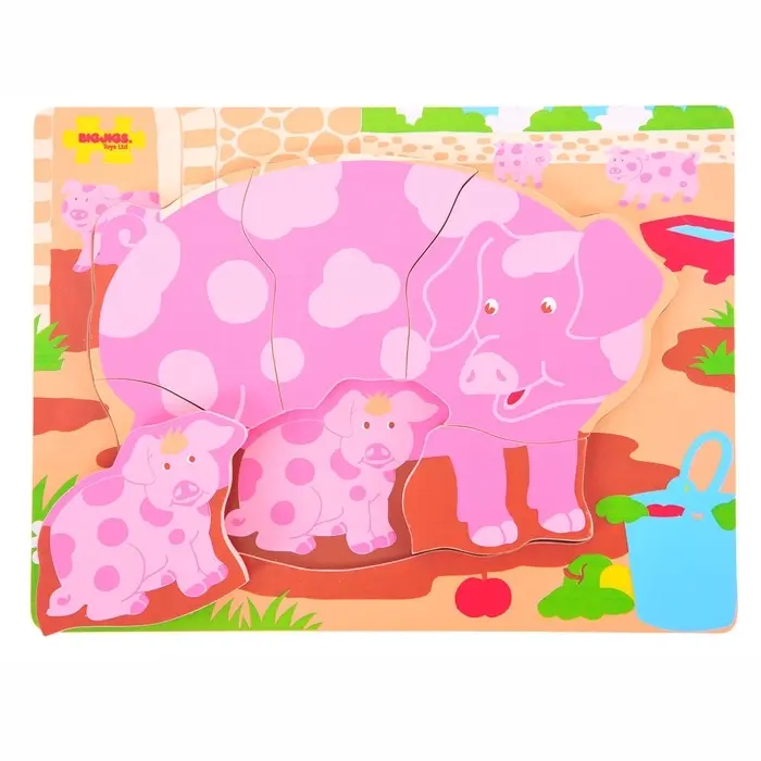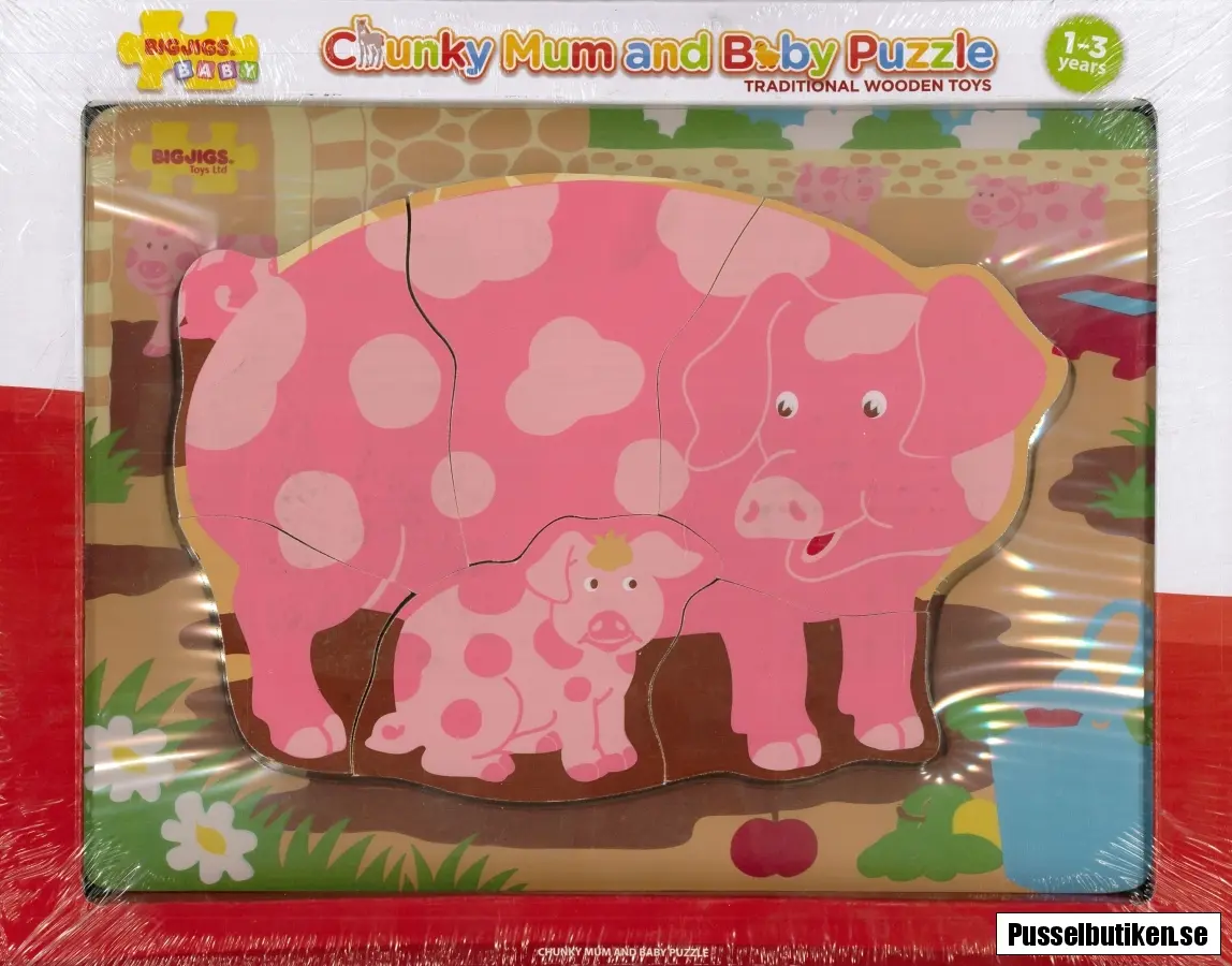 Träpussel med sex stora och greppvänliga bitar. Lägg bitarna på rätt plats och se motivet växa fram, på bilden finns en sugga med sin lilla kulting. De leker i gyttjepölen och smaskar på äpplen. Motivet sträcker sig över ramen vilket ger pusslet lite extra liv.
