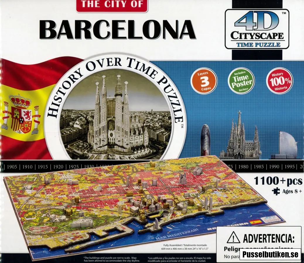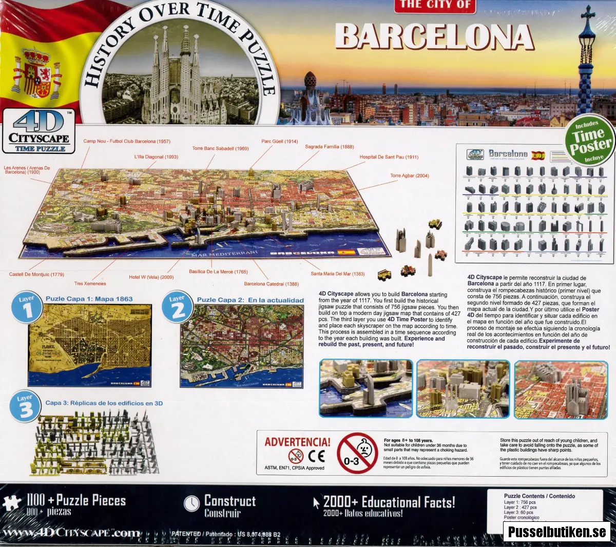4D Cityscape-pussel är ett patenterat pussel i tre lager som både är roligt och lärorikt. Första steget är att bygga ihop pusslets historiska grund. Pussla sedan ihop det översta lagret för modern tid. Använd den medföljande tidslinjen för att identifiera och placera varje byggnad på pusslet enligt det år som byggnaden uppfördes. Detta är det sista lagret för att slutföra 4D Cityscape pussel. För att putsa till plastdetaljernas kanter rekommenderar vi ett mjukt sandpapper.