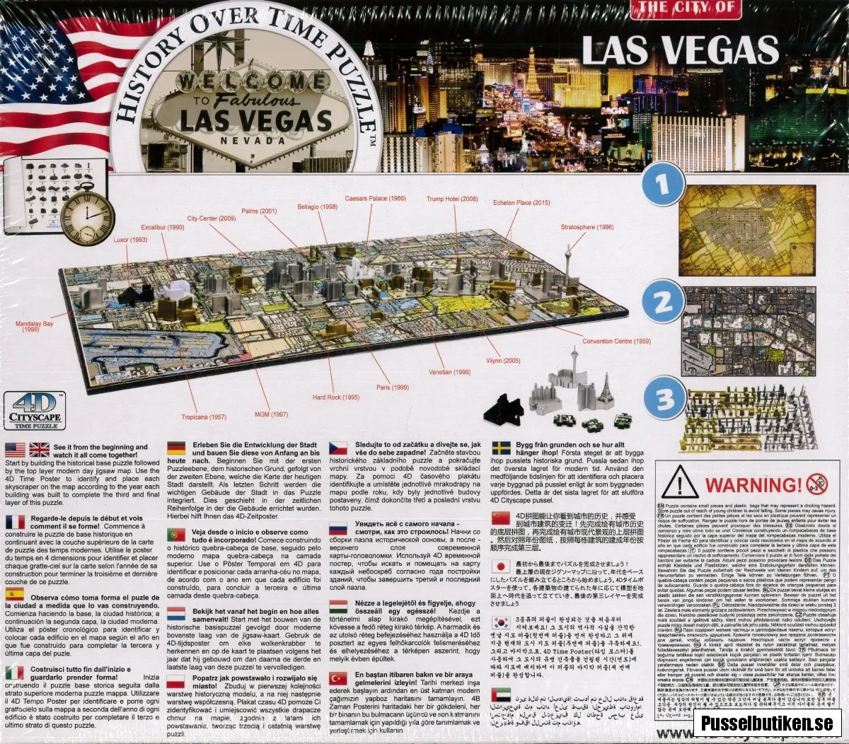 4D Cityscape-pussel är ett pussel i tre lager som både är roligt och lärorikt. Första steget är att bygga ihop pusslets historiska grund. Pussla sedan ihop det översta lagret för modern tid. Använd den medföljande tidslinjen för att identifiera och placera varje byggnad på pusslet enligt det år som byggnaden uppfördes. Detta är det sista lagret för att slutföra 4D Cityscape pussel. För att putsa till plastdetaljernas kanter rekommenderar vi ett mjukt sandpapper.