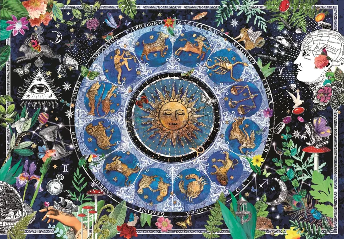 En karta över stjärntecken med solen som symbol i centrum. Här finns de olika stjärntecknens namn med på latin och den cirkelformade kartan är omgiven av stjärnor, djur, insekter, växter och symboler. Ett pussel med många detaljer vilket ofta bidrar till lättsamma och spännande pusselstunder med mycket att upptäcka medan bitarna faller på plats.