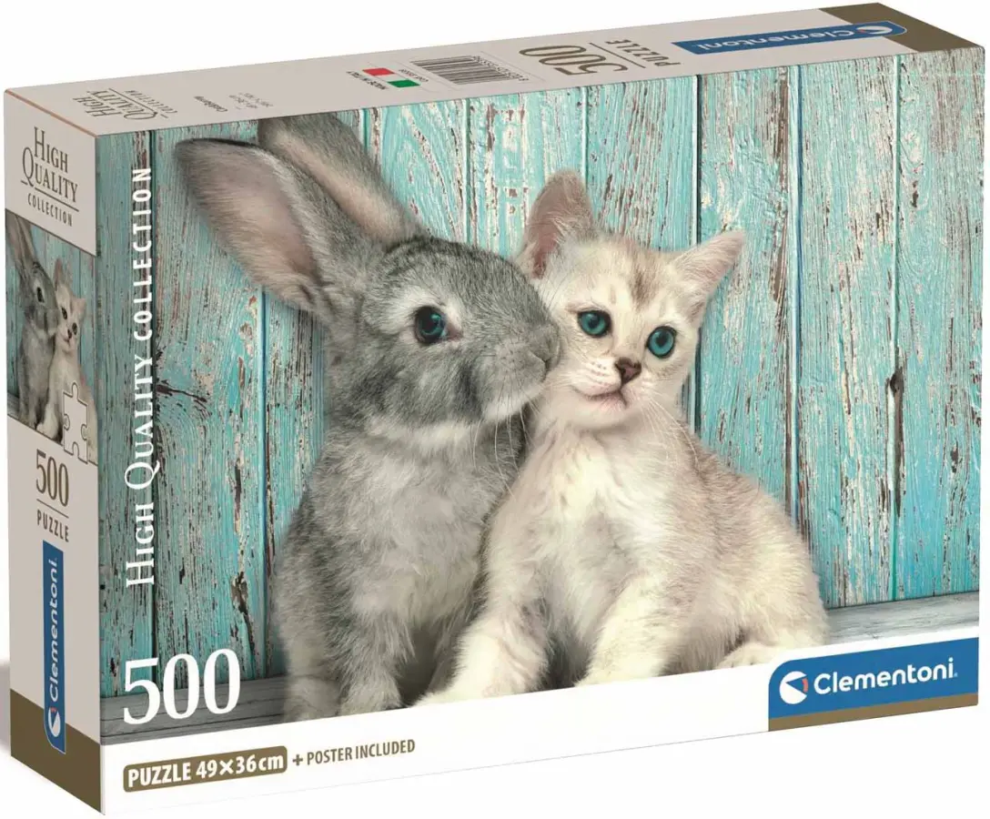 En grå kanin och en liten ljus kattunge är bästa vänner. De sitter och myser på ett trädäck mot en ljusblå husvägg som matchar deras blå ögon. Ett gulligt pusselmotiv för alla djurälskare!