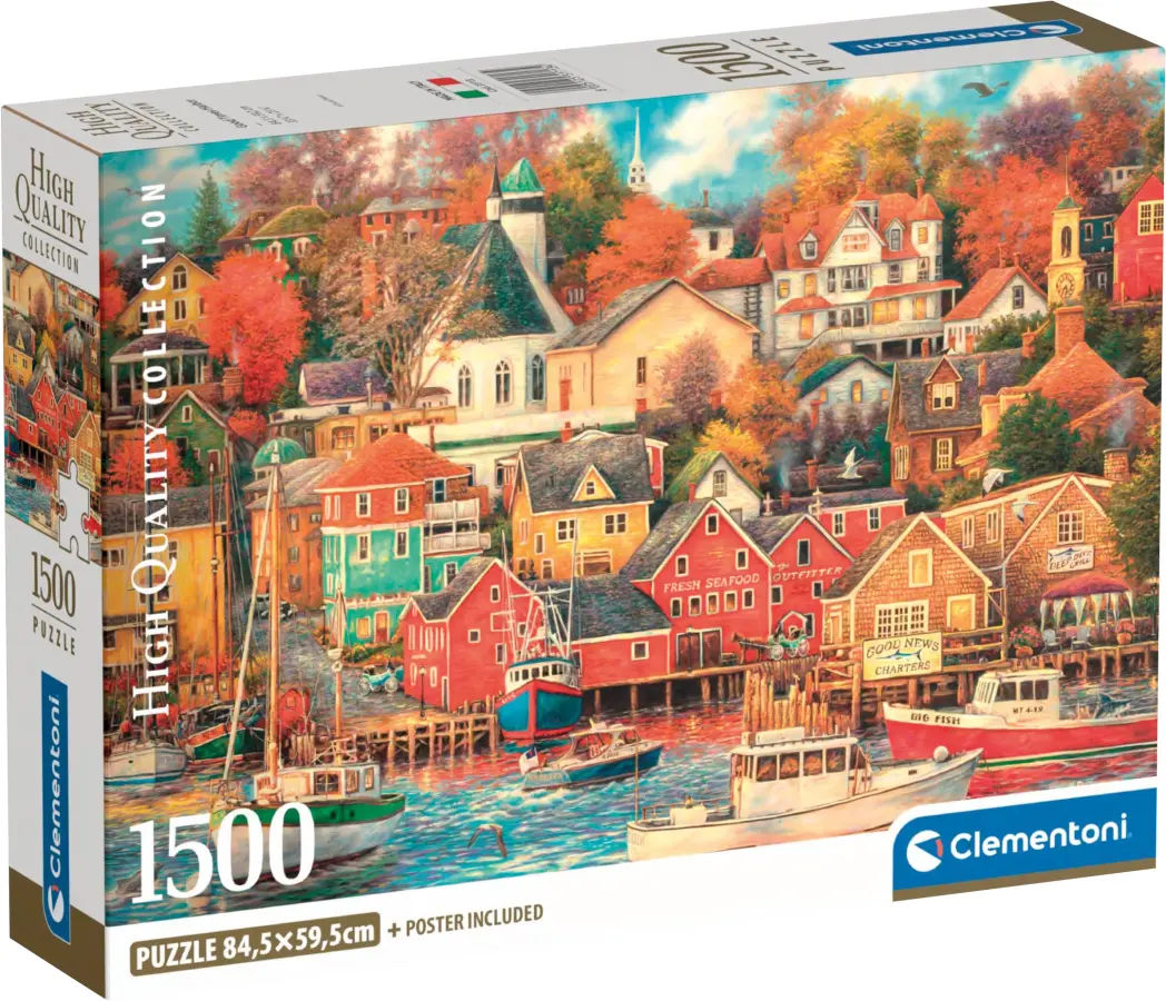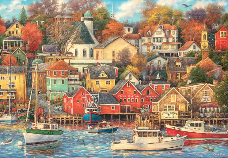 Chuck Pinson har målat det här mysiga pusselmotivet av en pittoresk hamnstad omgiven av vackra höstfärger.