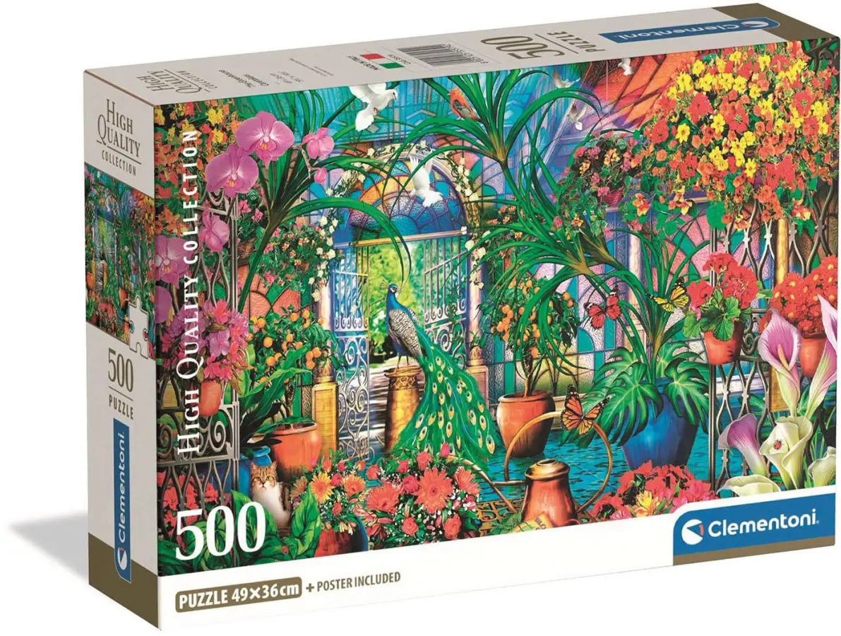Portarna står öppna till trädgårdens fantastiska växthus. Här frodas exotiska växter, färgglada blommor och små apelsinträd i krukor. En ståtlig påfågel syns i centrum av motivet och andra djur som fjärilar, duvor och nyckelpigor verkar också trivas i den lugna atmosfären. Men duvorna får nog hålla sig i luften, det verkar nämligen även vara en liten katt som kommit in i växthuset idag.