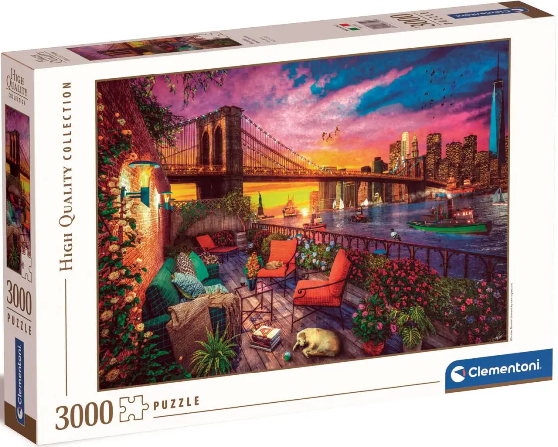 På en balkong i Manhattan (New York City, USA) råder ett stilla lugn. Den är fint inredd med en härlig soffa och mjuka fåtöljer, och mängder av blommor i olika färger. Inte konstigt att familjens hund och katt har hittat var sitt ställe att somna på här ute! Här står också ett rödvinsglas och en trave böcker och väntar på någon. Från balkongen har man en hisnande vacker vy över ett Manhattan i solnedgång. Ännu ett mästerverk i romantikens tecken, av den prisade konstnären Dominic Davison.