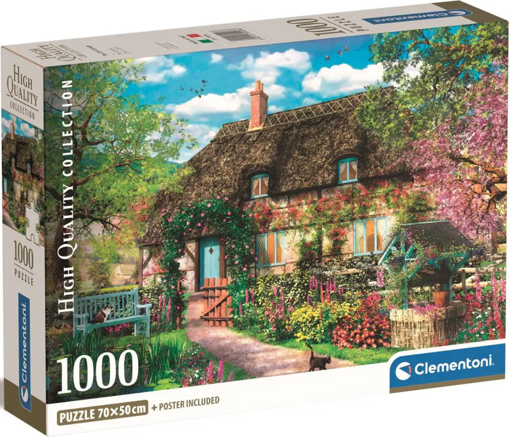 Grinden står öppen och vi är välkomna att promenera fram längs grusgången, och in i en fantastisk trädgård full av blommor! Gången leder oss fram till ett brittiskt korsvirkeshus med halmtak och en blå dörr. Solen skiner och framför trädgården syns en gammeldags brunn och familjens katter som njuter av det fina vädret.