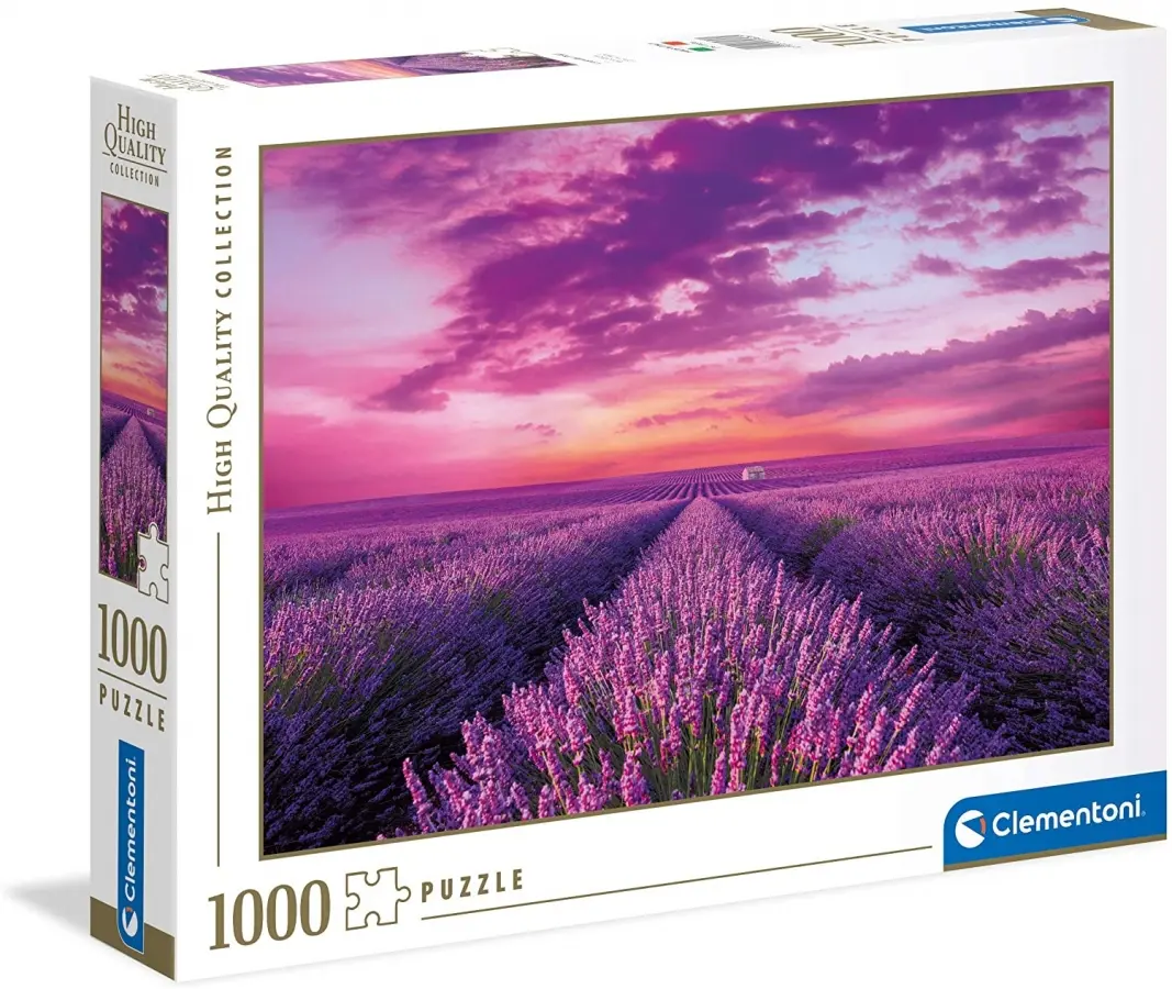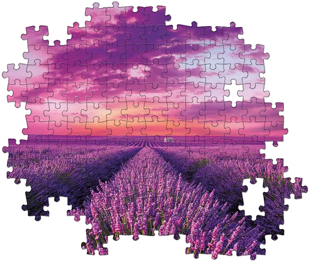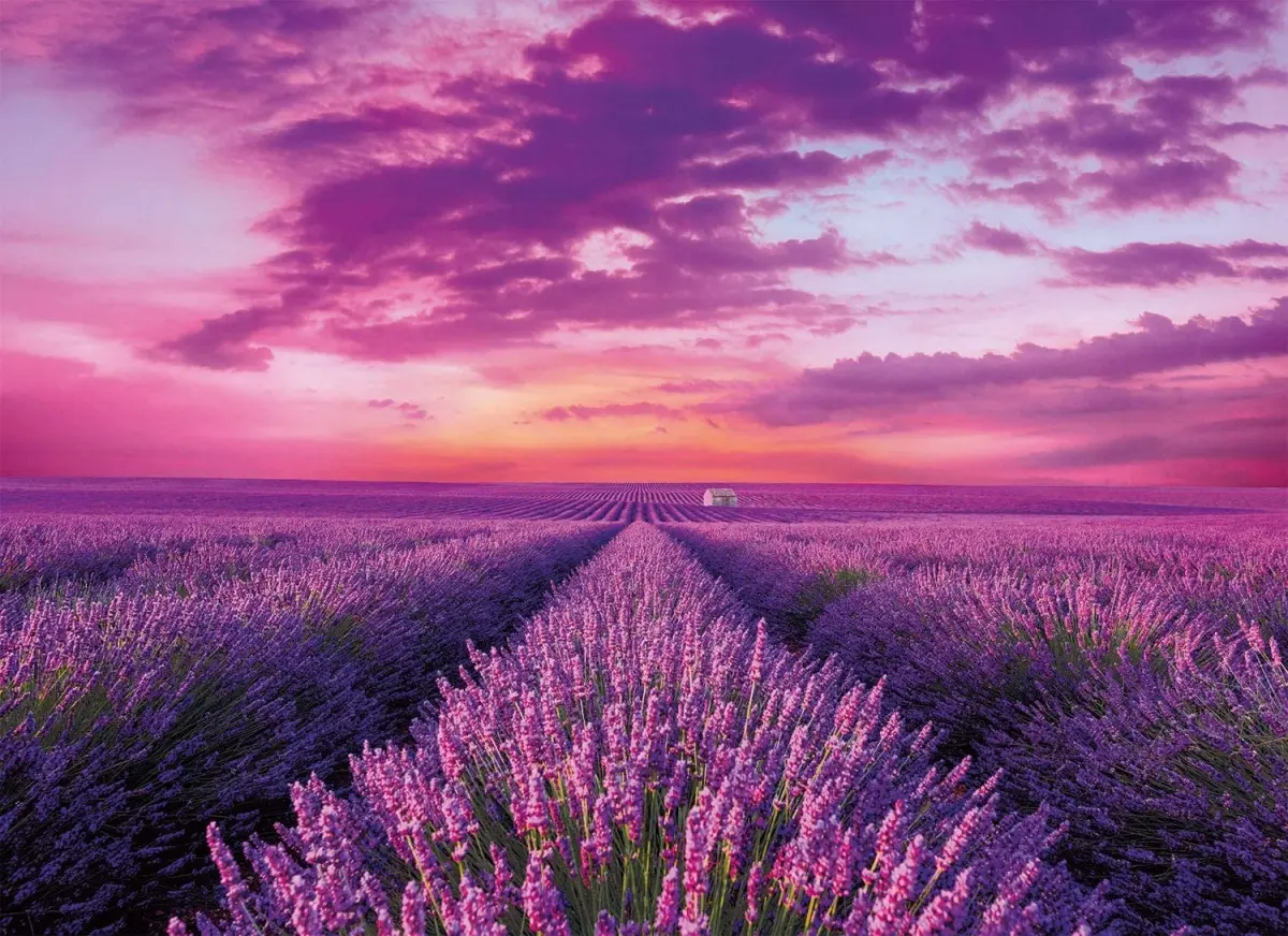 Lavendelfälten sträcker ut sig likt ett lila hav i detta fantastiskt vackra pusselmotiv! Solen är på väg ned och lavendelns lila toner speglas även i himlen. Mitt på fältet ligger också ett litet hus.