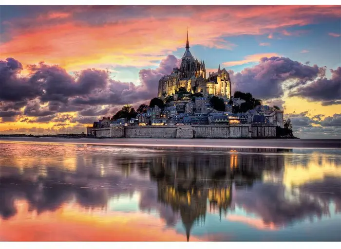 Vackert pusselmotiv av den franska kommunen och klostret under solnedgång. Le Mont-Saint-Michel är en av de minsta kommunerna i landet (med under 30 invånare), och är betraktat som ett världsarv enligt Unesco.