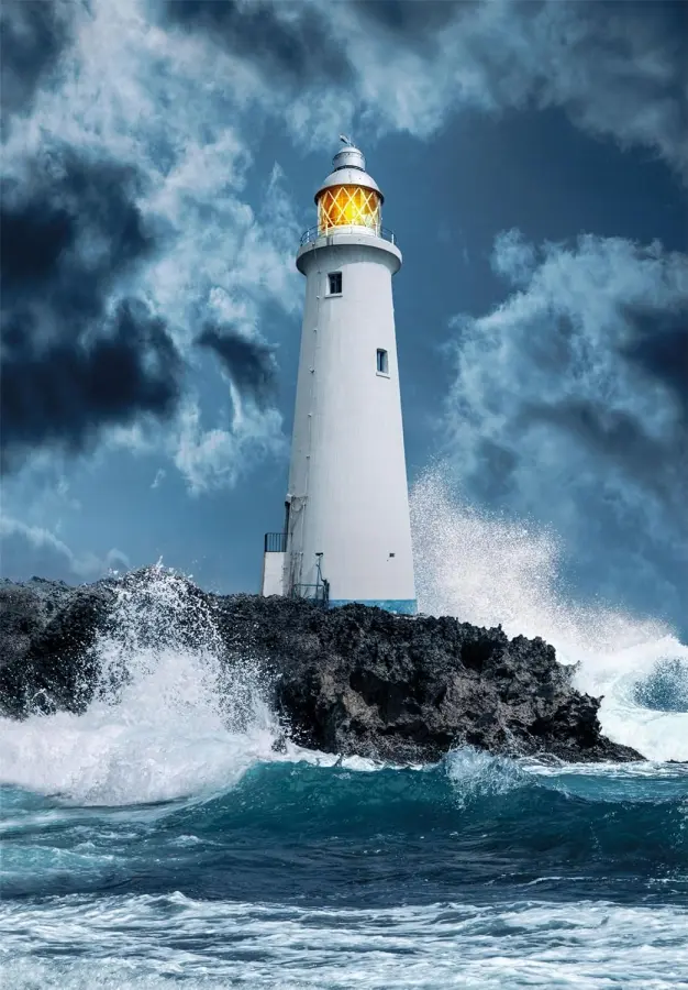 En vit fyr sträcker sig mot en mörkblå himmel och skummande vågor slår mot klipporna den står på, blåser det upp till storm mån tro? Tur då att dess varma sken kan guida alla säkert till havs.