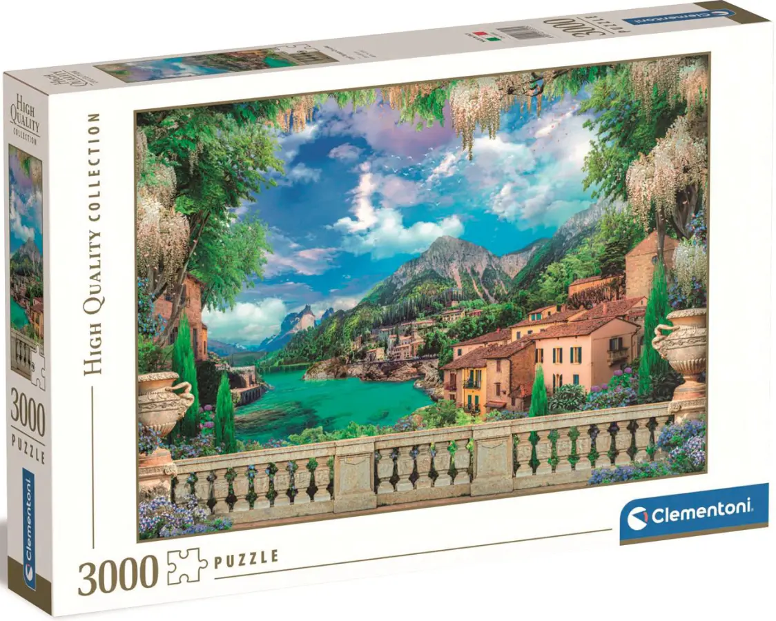 Från en pampig terras i sten har åskådaren en fantastisk vy över ett grönblått vatten, berg, gröna kullar och vackra gamla hus med putsade fasader. På himlen, som är blå med lilaskiftande moln, flyger vita fåglar. I framkant av motivet syns två stora stenkrukor, lila blommor samt trädgrenar som hänger som en ram kring motivet med dignande blomklasar i vitt och rosa.