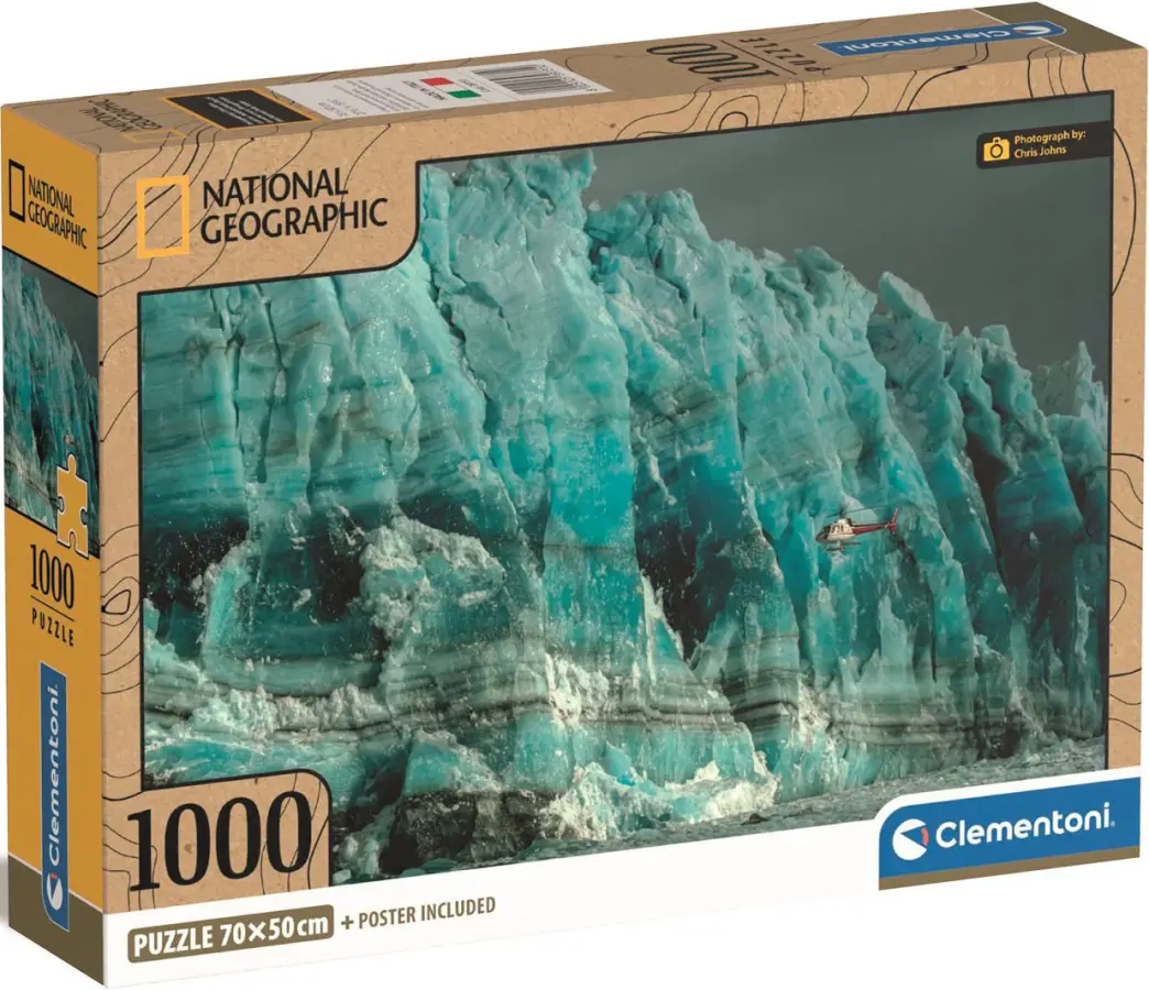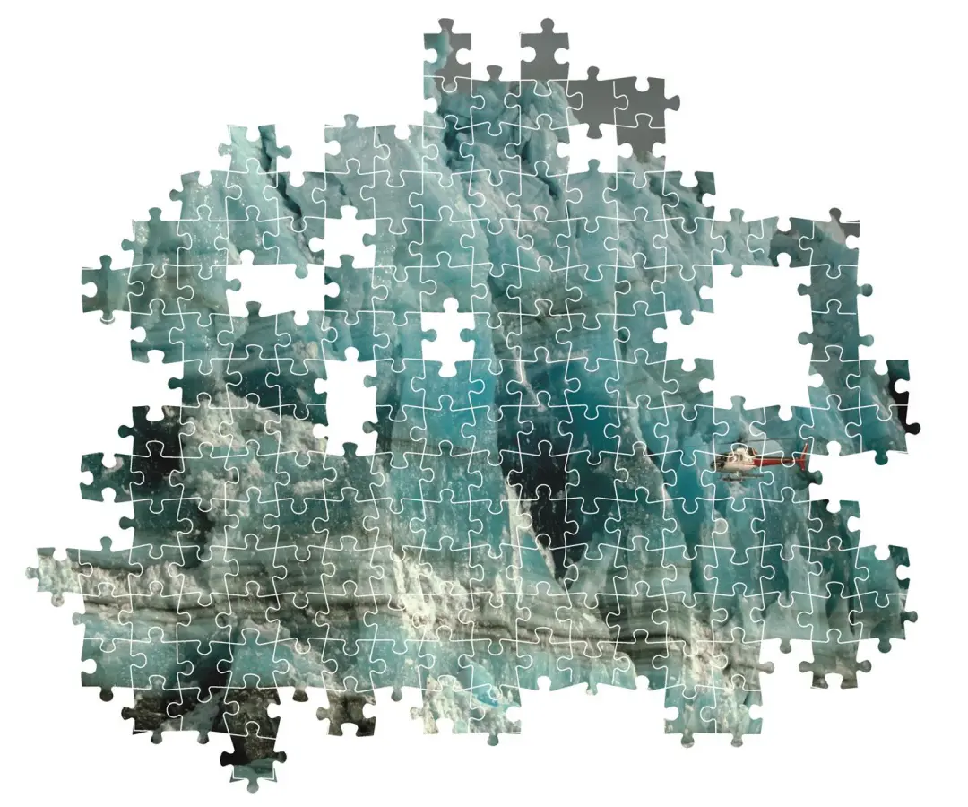 En mäktig vy över Hubbardglaciären, en glaciär som är permanent täckt av snö och is och vars trakter är nära nog obefolkade. En helikopter har vågat sig tätt inpå den mäktiga väggen av lager av is i olika turkosa nyanser. Det här pusslet är något av en utmaning där många av bitarna kommer att gå i samma färgskala.