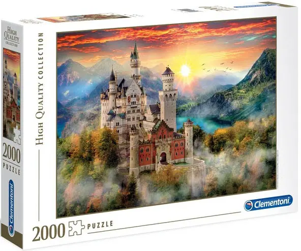 I motivet kan vi se slottet under hösten, med dimslöjor kring berg och trädkronor, och en vacker solnedgång.