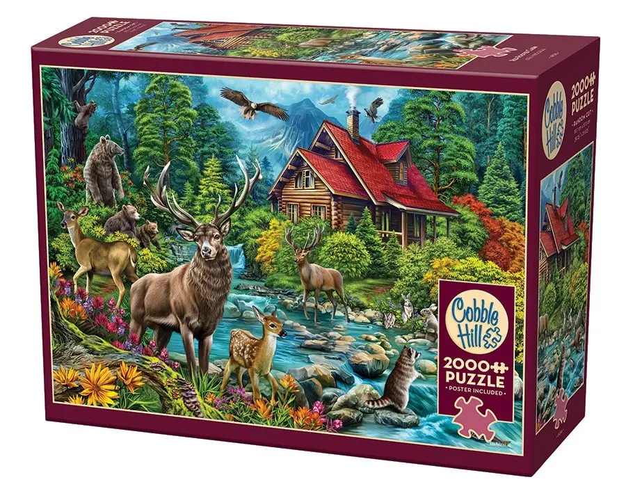 I det här motivet har skogens alla vilda djur kommit till bäcken för att leka. I bakgrunden ligger en timrad stugan med ett rött tak, någon där hemma har tänt en värmande brasa och man kan se röken som stiger ur skorstenen. Stugan ligger i en grönskande skog med utsikt mot bergen.