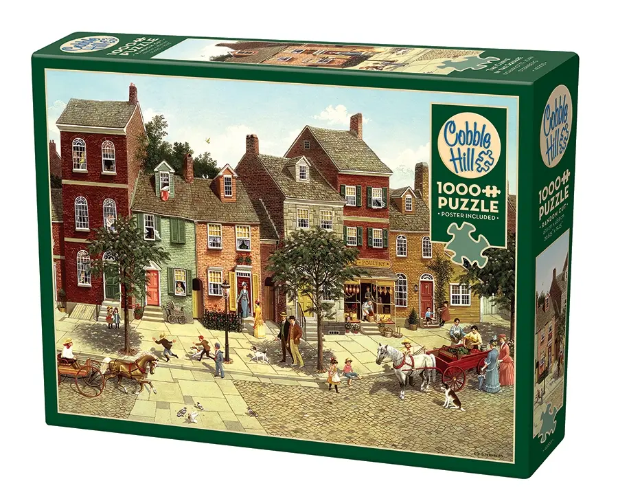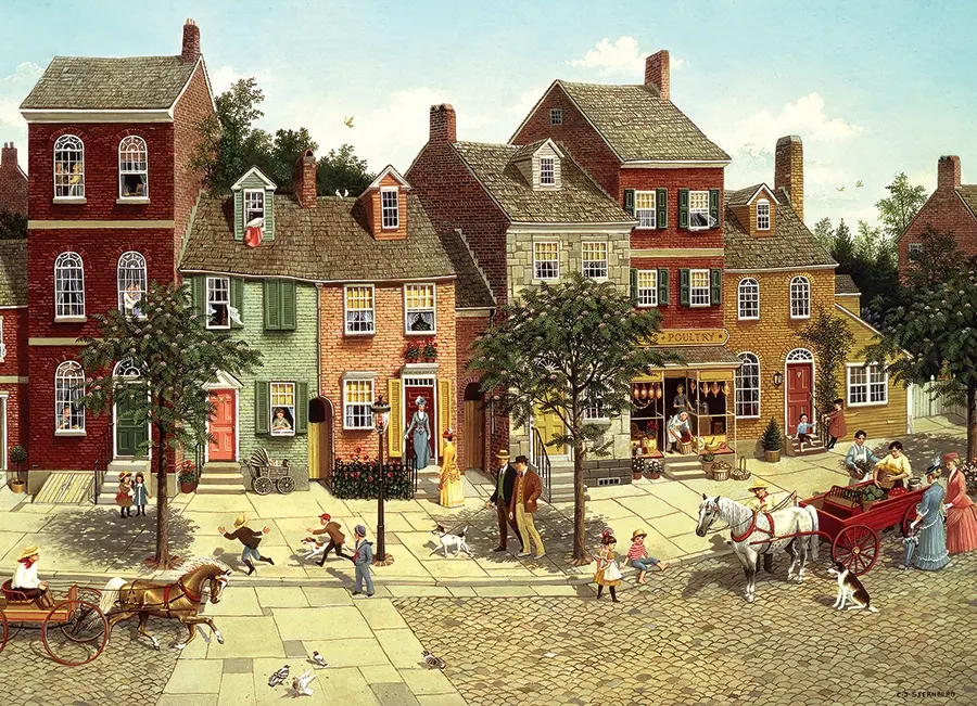 Kurvan på torget är platsen där alla i staden samlas. Barn och hundar jagar varandra, grannar ses för att prata lite och utbyta skvaller och droskor stannar med leveranser till stadens butiker. Några människor har ingen vidare lust att gå ut, men roar sig med att se på allt som händer från sitt fönster. De vackra husfasaderna och kullerstensgatorna för oss till en nostalgisk tid, en solig sommardag för länge sedan.