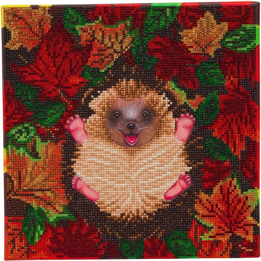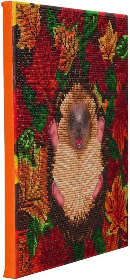 I det här motivet ligger en glad liten igelkott på rygg med fötterna i vädret, bland frasiga höstlöv.