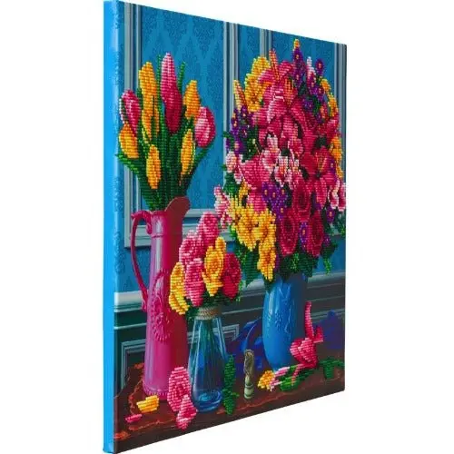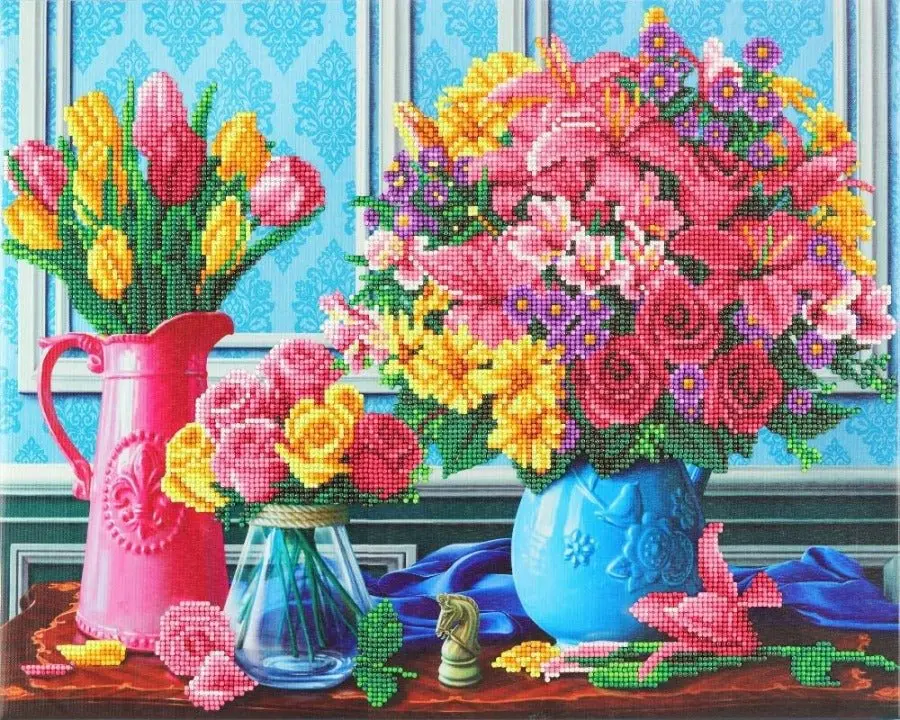 I det här motivet ser vi vackra vaser fulla av blommor i rosa, gula och lila toner. Vaserna står i ett rum med turkost mönstrad tapet, och på bordet som de står placerade på ligger fallna kronblad och ett böljande blått sidentyg.