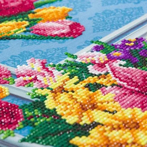 I förpackningen ingår allt du behöver: självhäftande canvastavla med motivet, kristaller, applikatorpennor, extra penngrepp för en mer ergonomisk pennföring, sorteringsbrickor (2st), gelévax, extra zip-påsar och instruktioner.