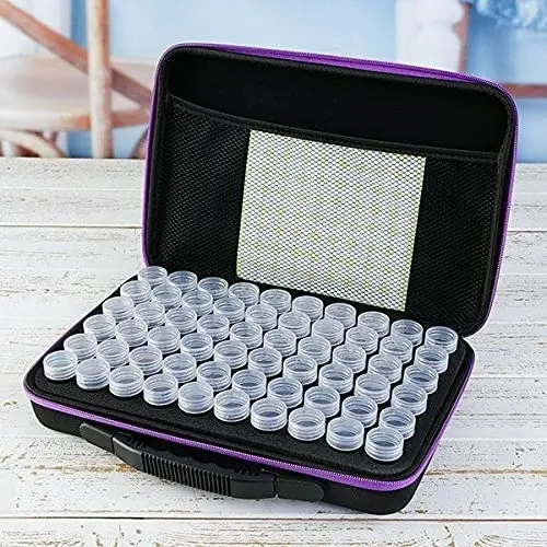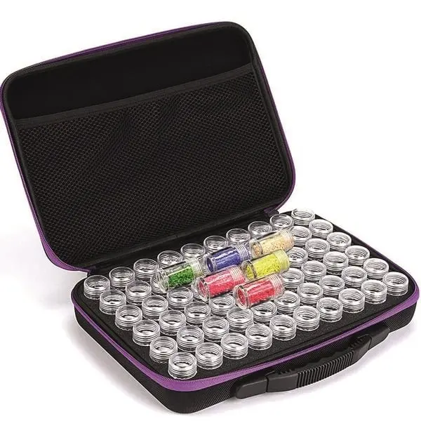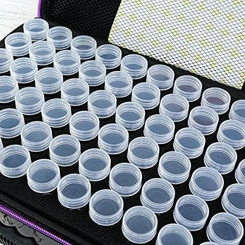 Inuti väskan finns det 60st tomma genomskinliga plastburkar med skruvlock, perfekt för att förvara dina diamanter/kristaller.
