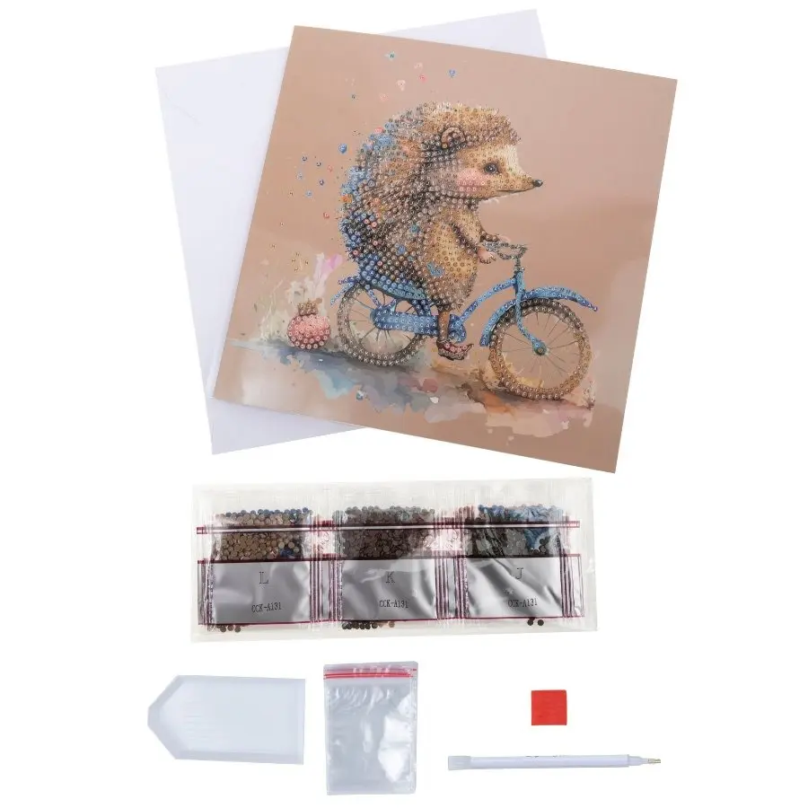 Gör ditt eget kort i Crystal Art, med motiv av söt igelkott som cyklar!