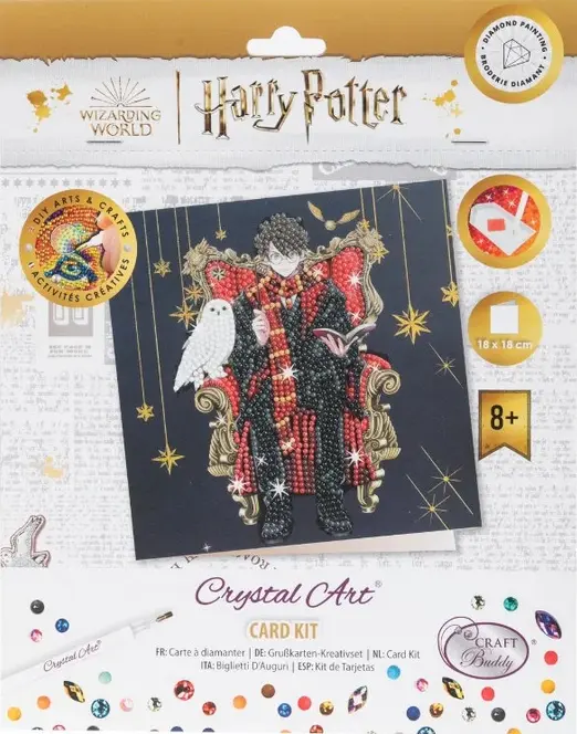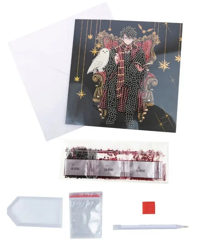 Gör ditt eget kort föreställande Harry och ugglan Hedwig från Harry Potter! Klistra på de små kristallerna och skapa det vackra motivet för hand.