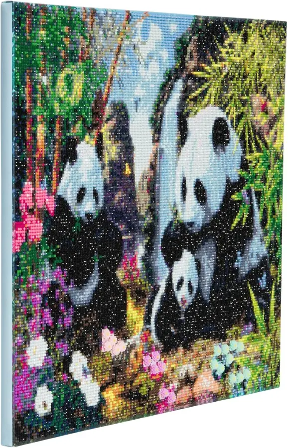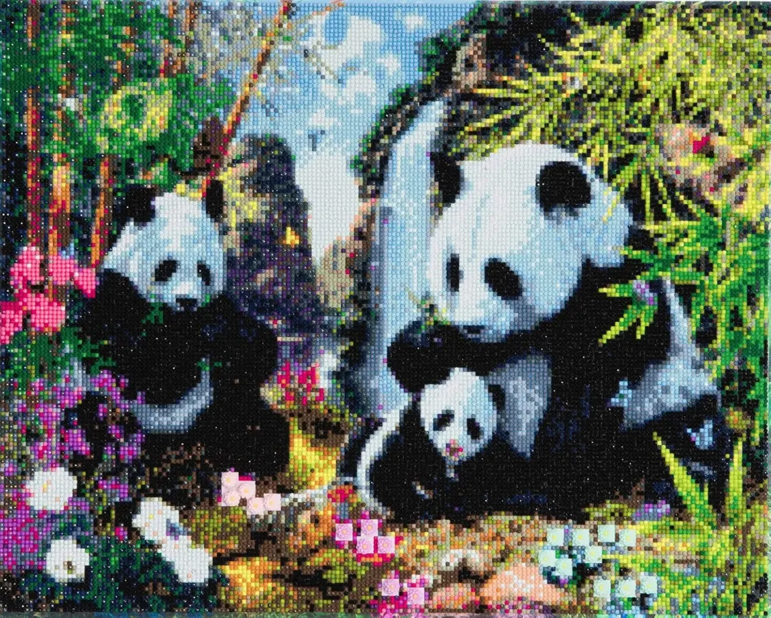 I det här motivet syns en Pandafamilj, omgivna av grönskande exotisk natur, färggranna blommor och ett forsande vattenfall.