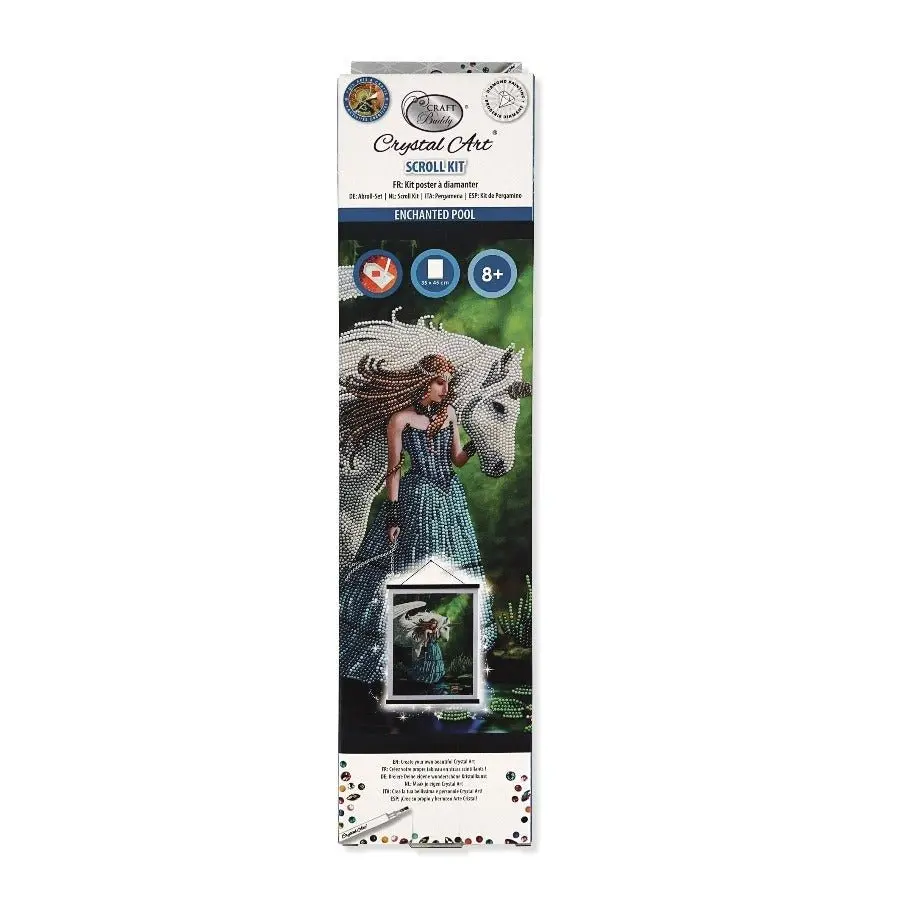 Diamantmålnings-kit med allt du behöver för att skapa en vacker tavla med diamantmålning. I motivet ser vi en kvinna i en vacker blå klänning, hon står bredvid sin vita häst omgivna av grönska och med blickarna riktade mot en näckrosdamm.