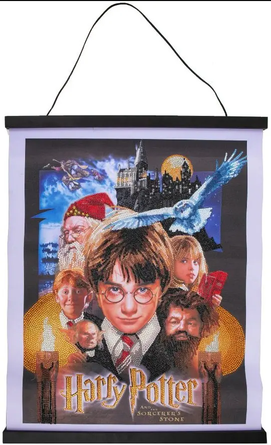 Diamantmålnings-kit med allt du behöver för att skapa en vacker tavla med diamantmålning. Motivet är ett kollage av kända karaktärer och symboler ur Harry Potters magiska värld.
