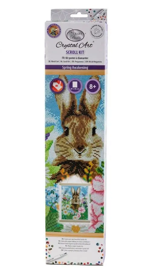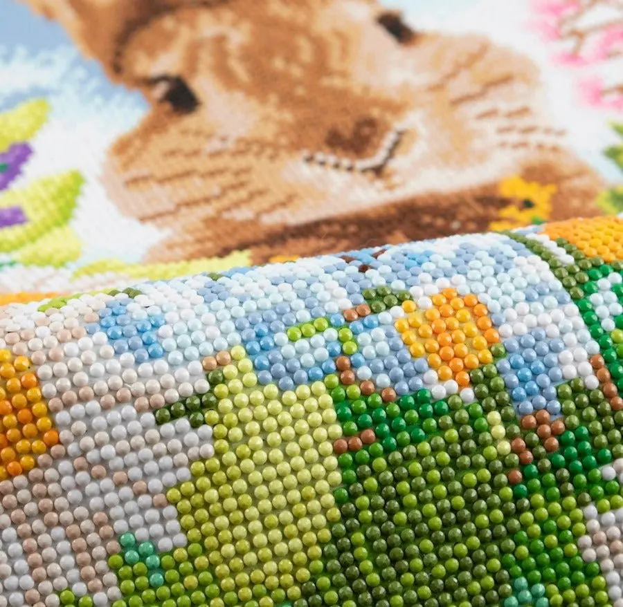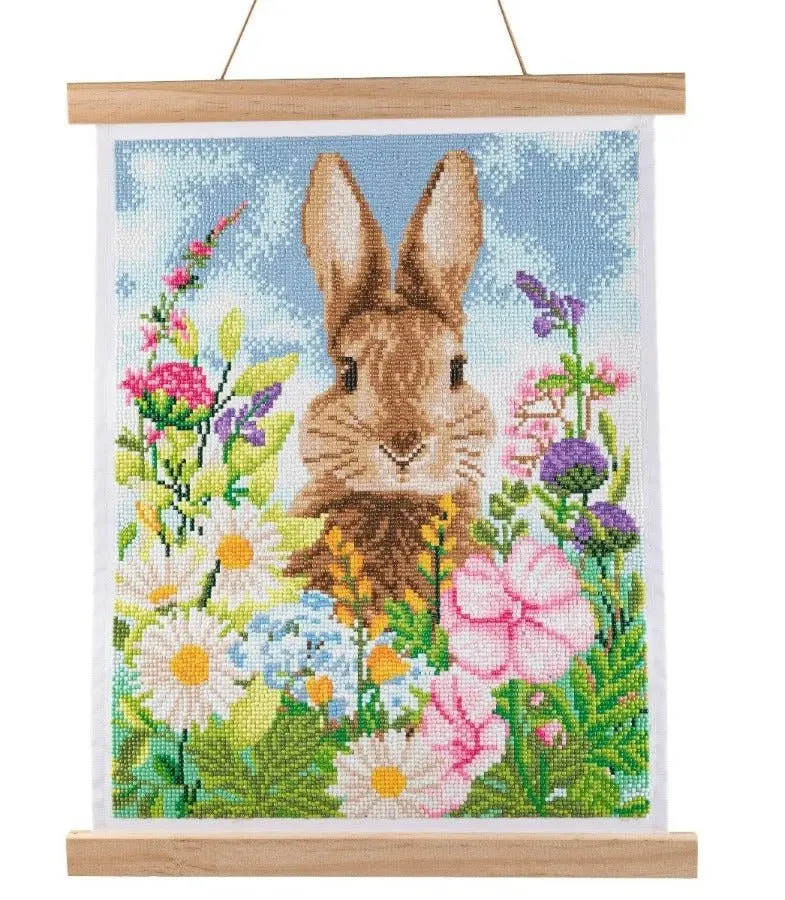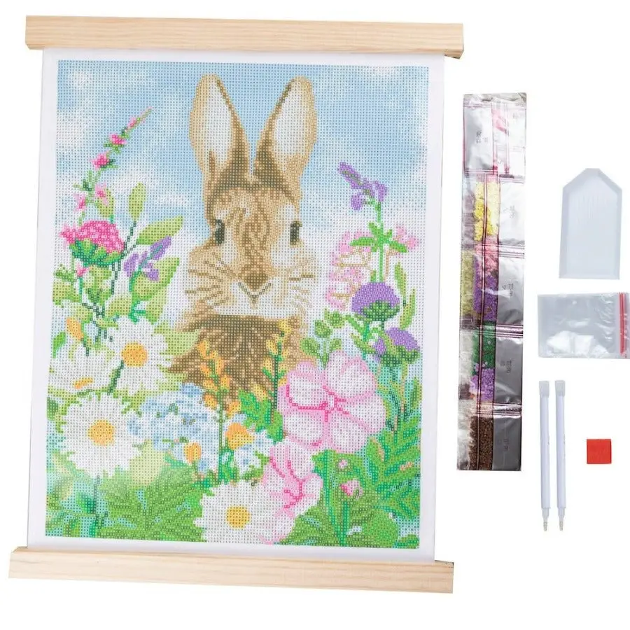 Diamantmålnings-kit med allt du behöver för att skapa en vacker tavla med diamantmålning. I motivet sitter en hare på en färgsprakande blomsteräng.
