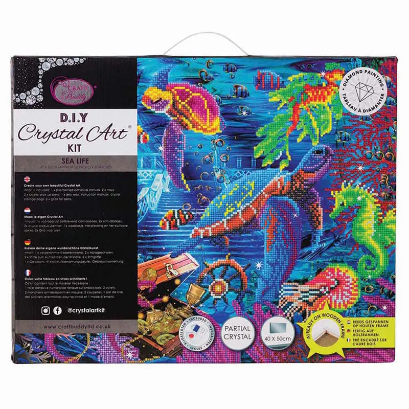 I förpackningen ingår allt du behöver: självhäftande canvastavla med motivet, kristaller, applikatorpennor, extra penngrepp för en mer ergonomisk pennföring, sorteringsbrickor (2st), gelévax, extra zip-påsar och instruktioner.