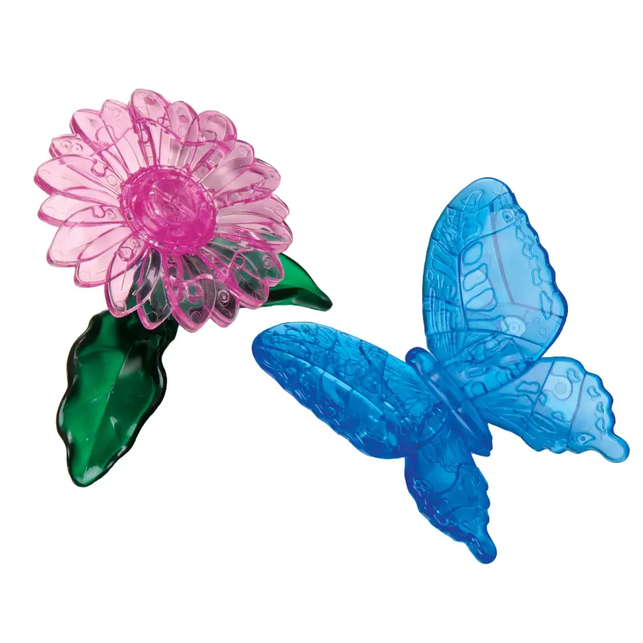 Ett 3D-Kristallpussel i form av en blå fjäril som sitter på en rosa blomma.