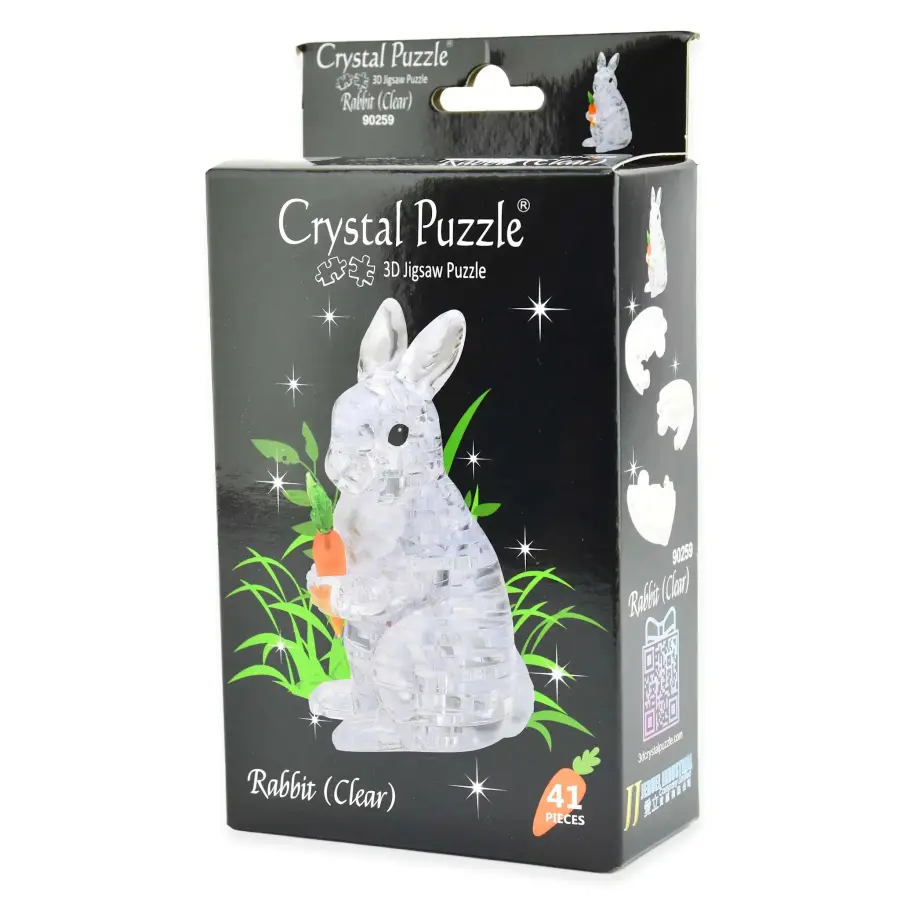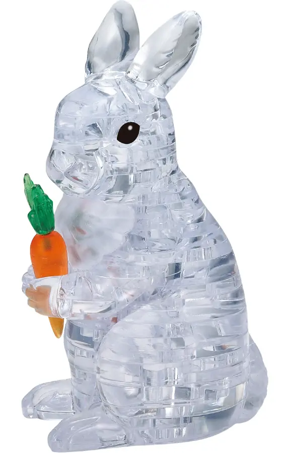 Ett 3D-Kristallpussel i form av en kanin som håller i en morot.