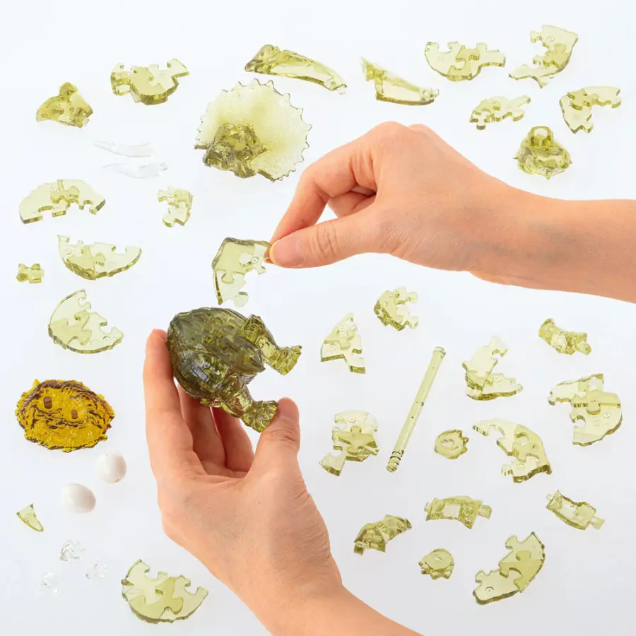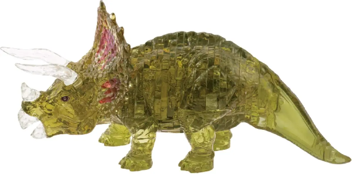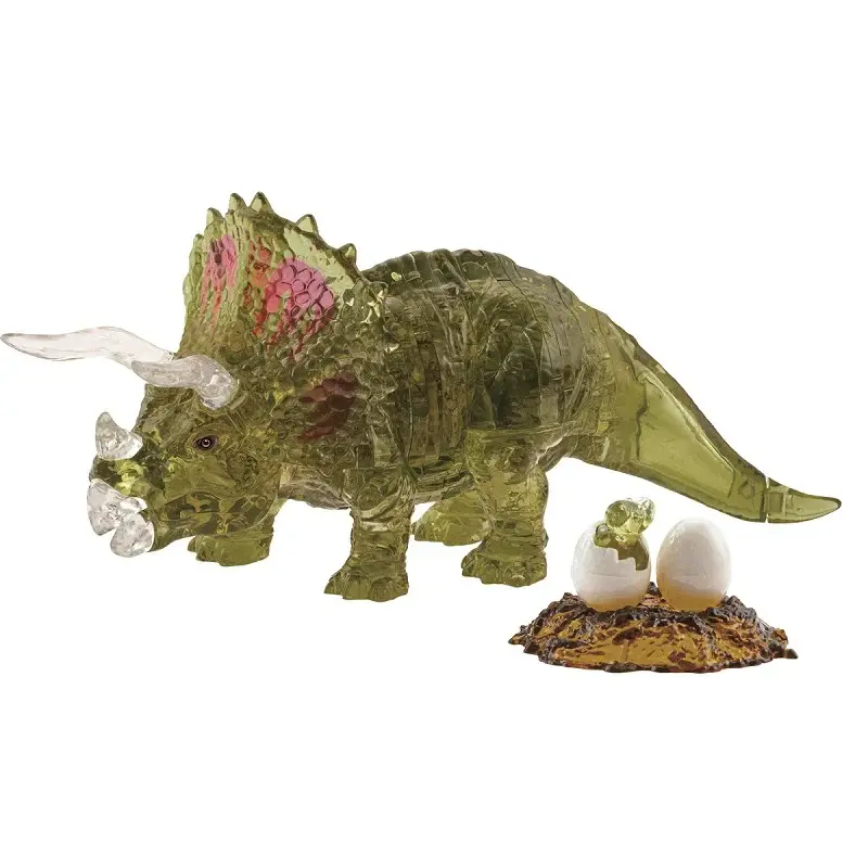 Ett 3D-Kristallpussel i form av en grön Triceratops (dinosaurie) med bo och ägg.