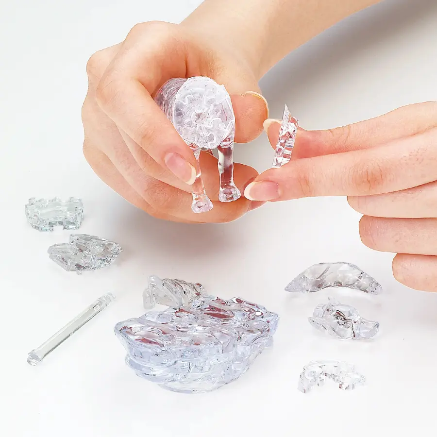Följ stegen i manualen för enkel montering. Hantera delarna försiktigt, eftersom de är ömtåliga. Inget lim behövs, men om du vill kan du använda ett lim för att säkerställa att pusslet förblir stadigt och intakt över lång tid (lim ingår ej). När ditt pussel är monterat kan du njuta av det som en dekorativ pjäs i ditt hem.