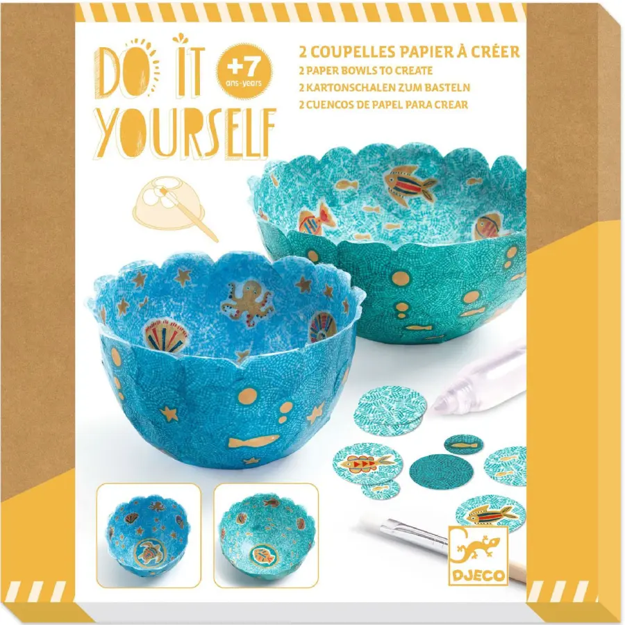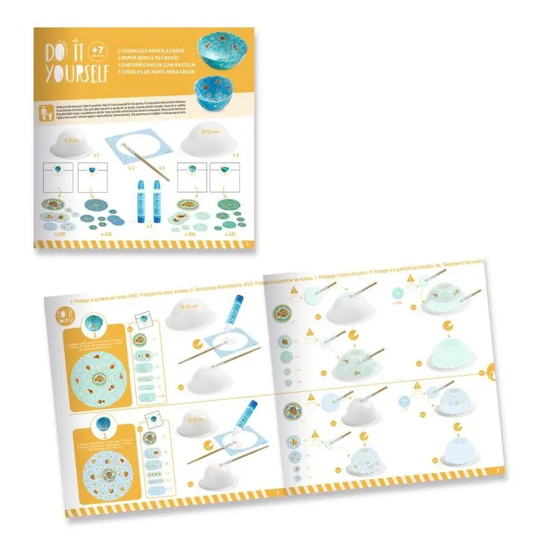 Ett komplett pyssel-kit som innehåller instruktioner och allt material som behövs för att skapa två underbara skålar, endast bestående av tunna papperscirklar och lim.