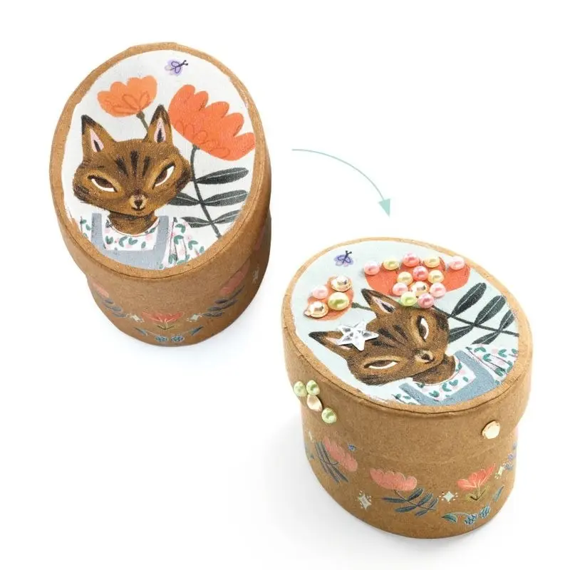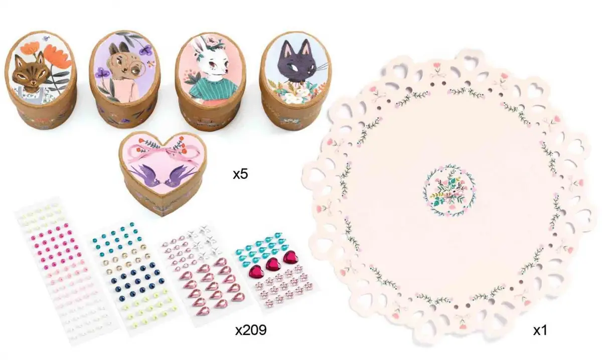 Ett charmigt och lagom kreativt pyssel kit där du får 5 snygga små askar att dekorera med hjälp av över 200 självhäftande dekorstenar.