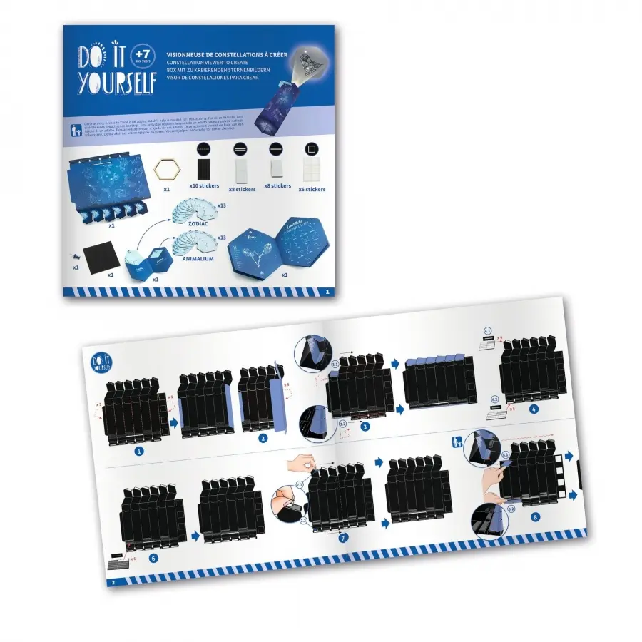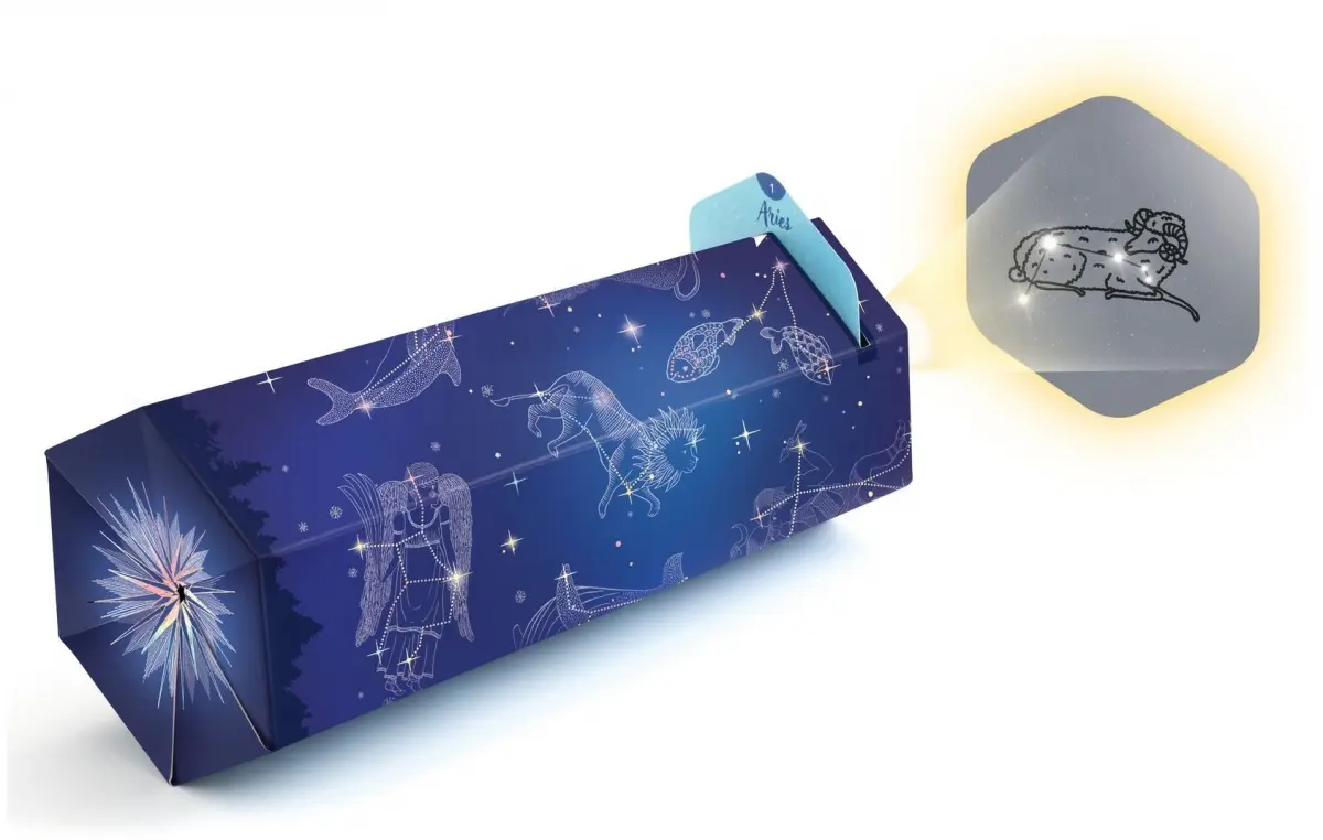 Montera visaren, stansa ut stjärnorna på korten och återskapa mönstren från de utvalda stjärnbilderna (zodiakens tecken och djur). Se hur deras former magiskt framträder genom den färdigmonterade tuben!