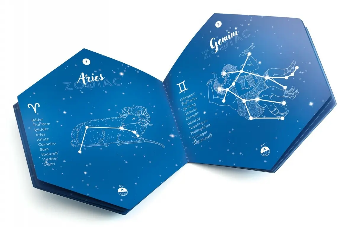 Setet låter dig utforska två fascinerande familjer av stjärnbilder: zodiakens tecken och djurkonstellationer. Produkten har exklusiva silverdetaljer som ger en lyxig finish.