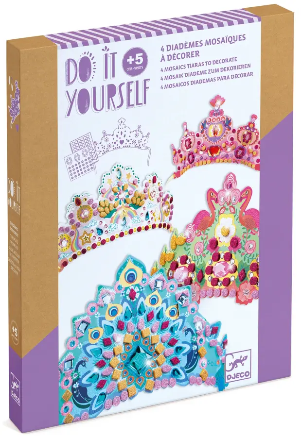 Innehåll: 4 illustrerade tiaror av kartong, 3 ark med glittrig självhäftande mosaik (cerise, ljusrosa, guld), 4 ark med självhäftande dekorationsstenar i olika former, 4 guldfärgade knytband att fästa tiarorna runt huvudet med och 1 häfte med inspiration och steg-för-steg instruktioner i bilder.