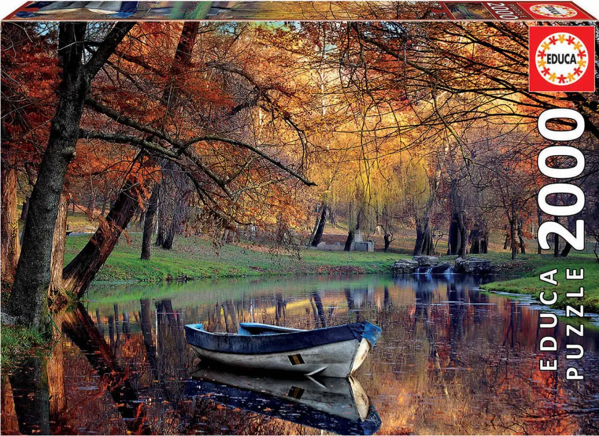 Det är höst och trädkronorna i parken skimrar i gult, orange och rött. I en spegelblank sjö ligger en liten båt och i bakgrunden skymtar man parkbänkar, precis lagom att slå sig ner på en stund.