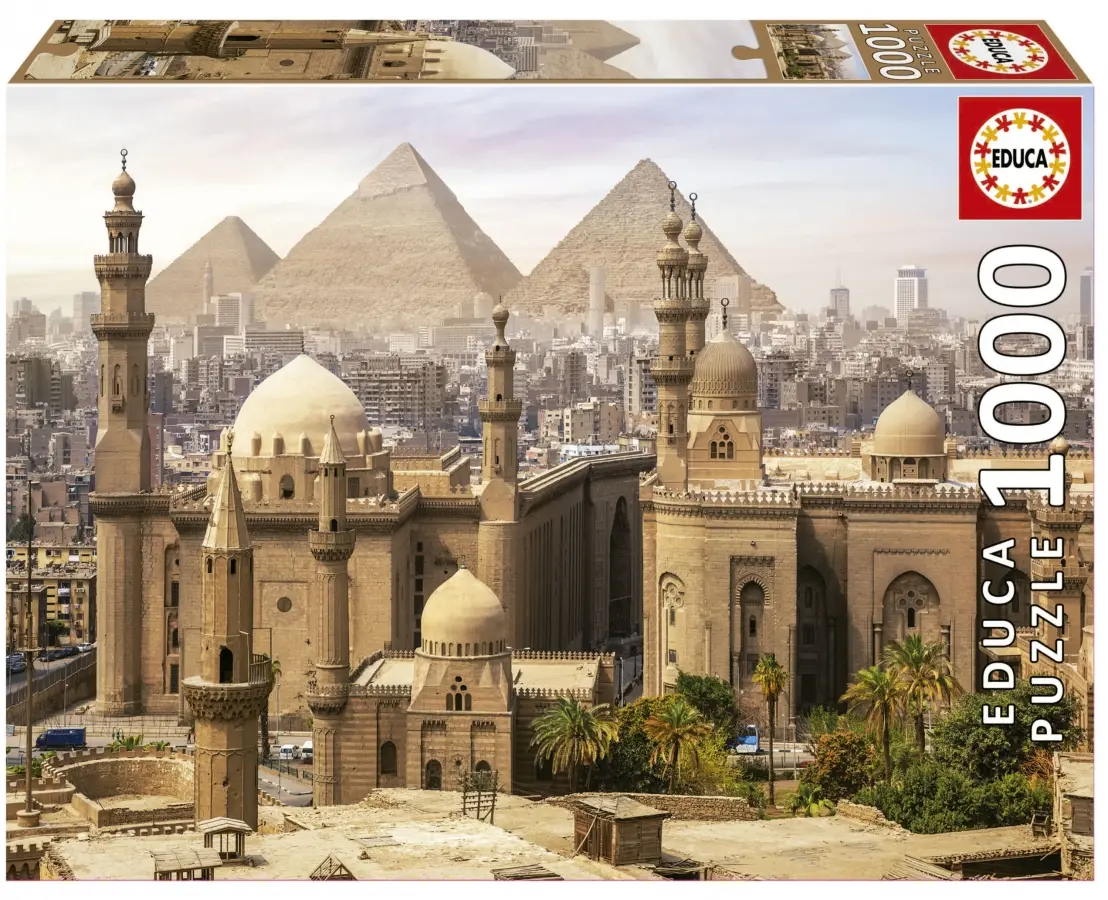 Här får vi följa med och se pyramiderna från en sida som kanske normalt inte gestaltas så ofta. Många gånger ser man bilder på pyramiderna mitt ute i öknen omgivna av sand. Men denna bild är tagen från motsatta sidan där man ser den omgivande staden Kairo och dess byggnader i det torra ökenlandskapet. I förgrunden syns Moskén-Madrassa av Sultan Hassan, med sina kända kupoler (en moské och islamsk skola).