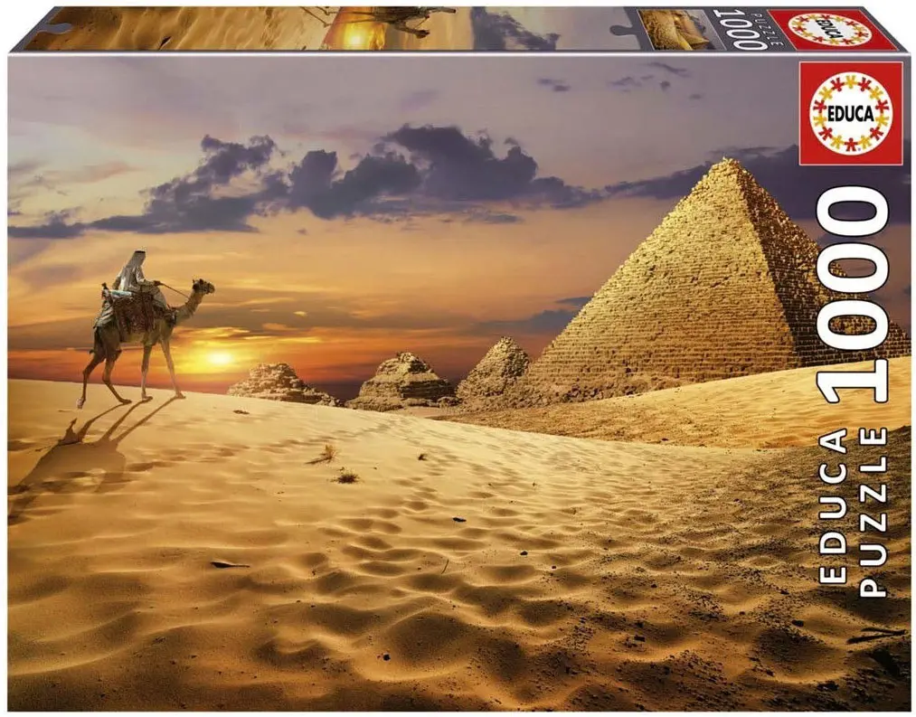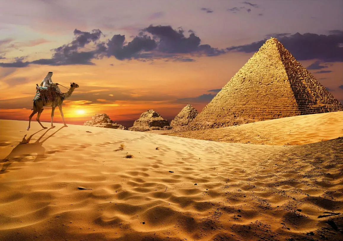 Någon stans i Egyptens är solen på väg att gå ner över pyramider och sandbankar. En man i traditionella arabiska vita kläder rider på en kamel med sikte mot pyramiderna.
