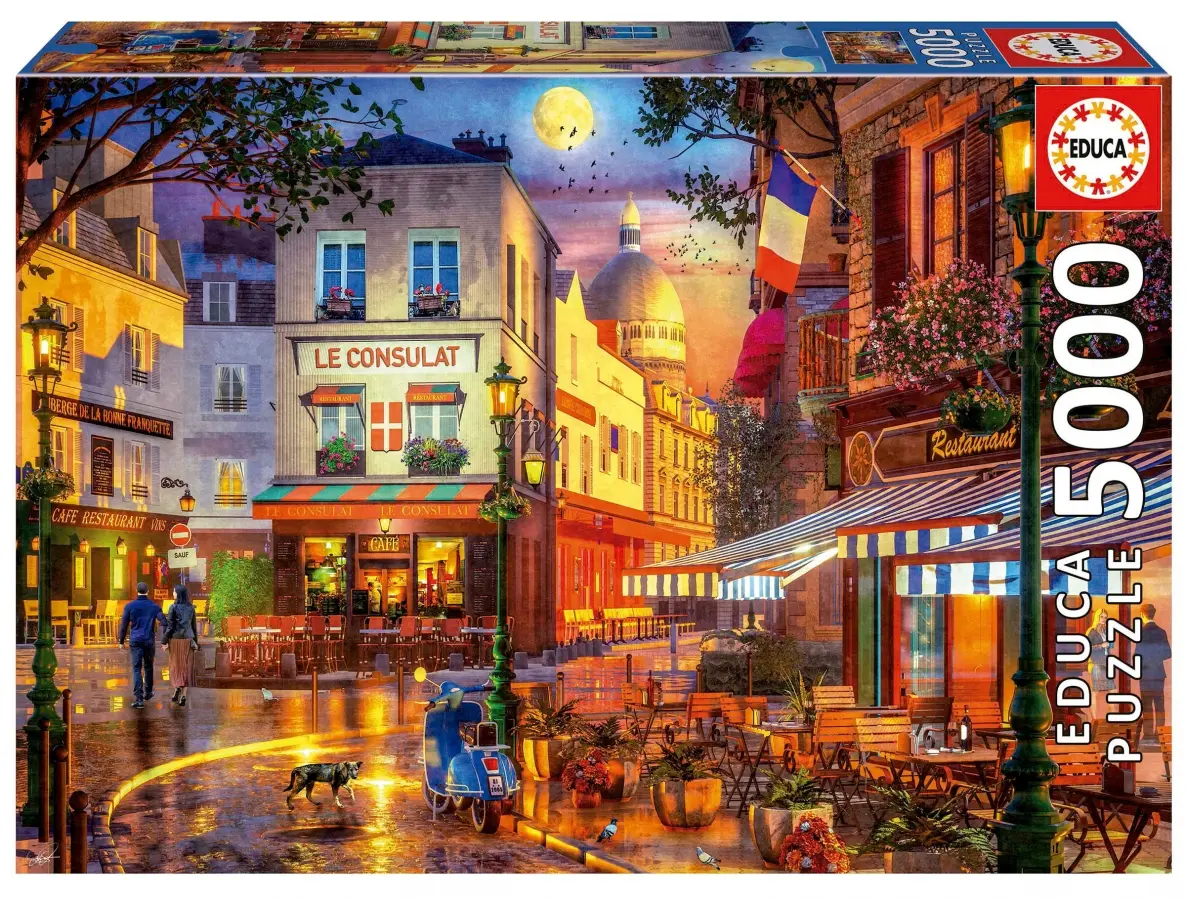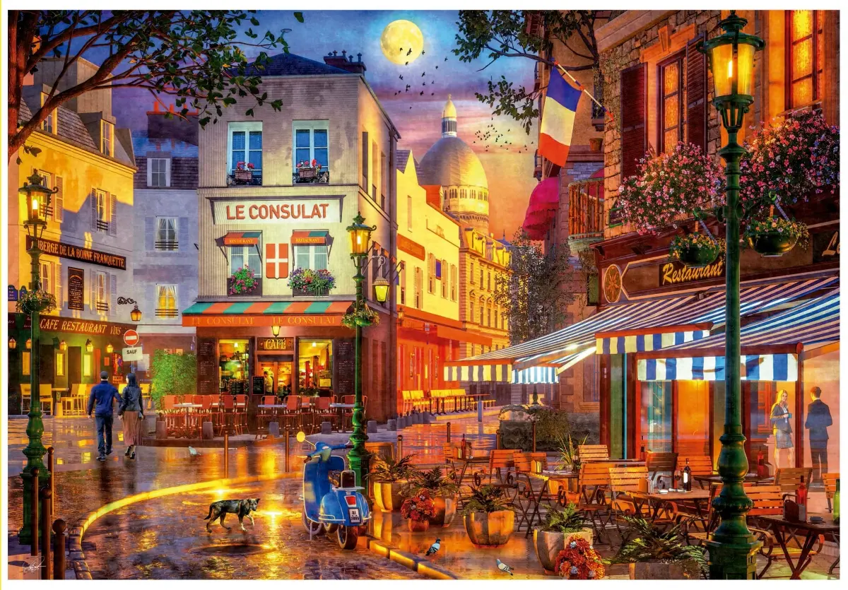Konstnären Dominic Davison är en mästare på stadsskildringar, ofta i romantisk och nostalgisk stil, där det är lätt att drömma sig in i sitt pusselmotiv. Här kan man nästan känna doften av våta kullerstenar från ett sommarregn och visst blir man sugen på ett besök på "Le Consulat"!