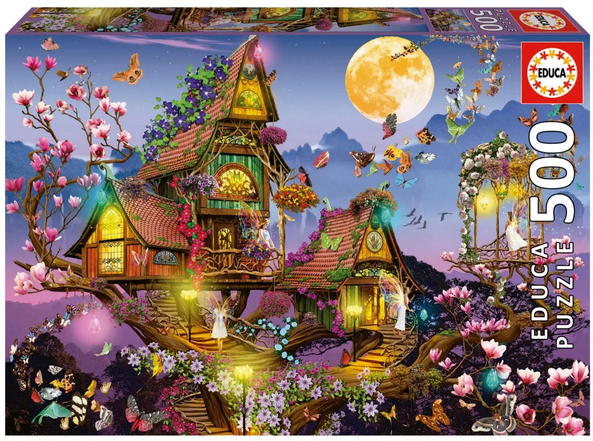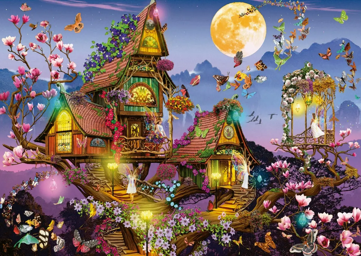 I ett blommande magnoliaträd bor det älvor med gnistrande regnbågsskimrande vingar. Deras hus är vackert byggda i trä, omgivna av blommor och med vackra glasfönster som strålar av ett varmt välkomnande ljussken. Månen är full och fjärilarna flyger i natten.