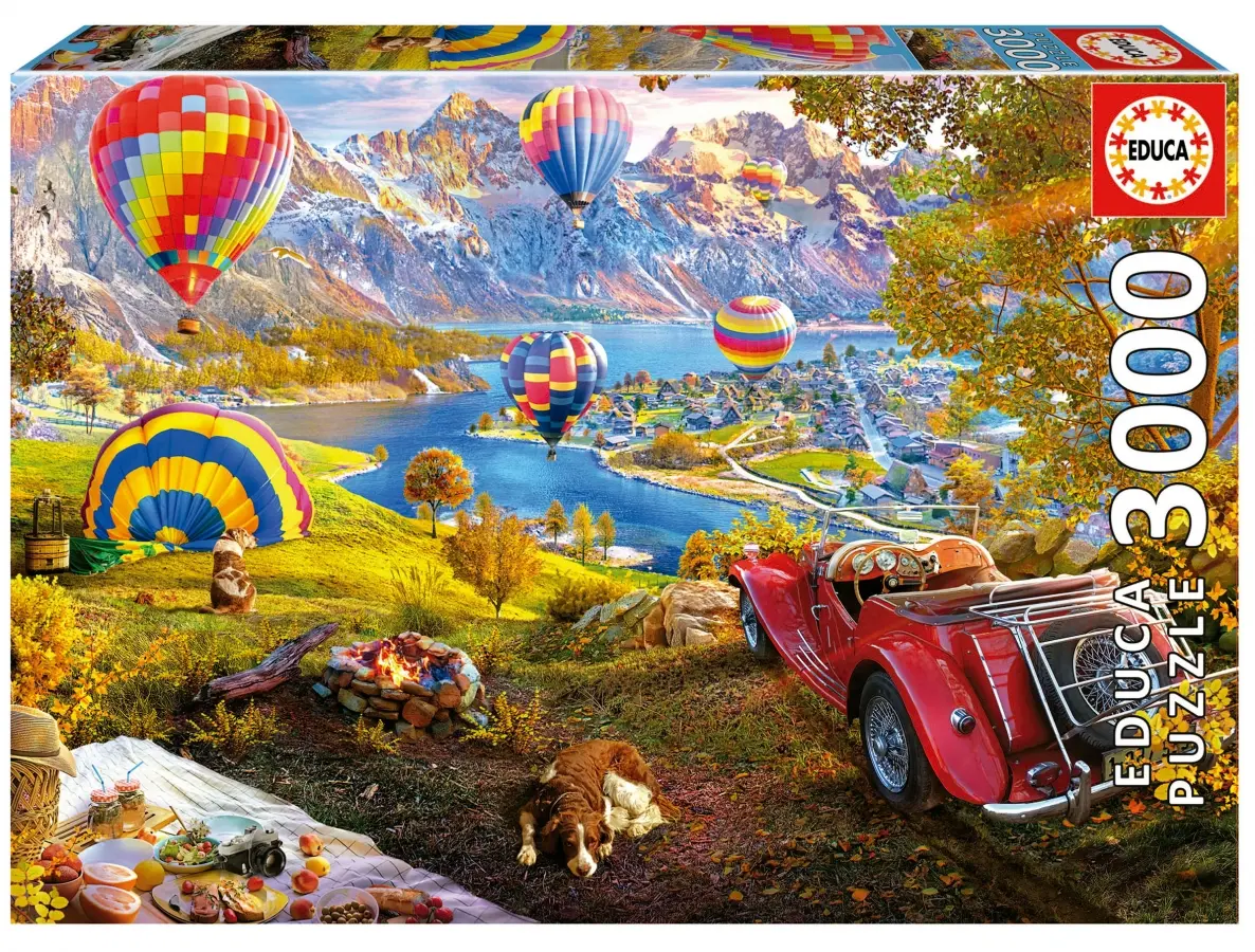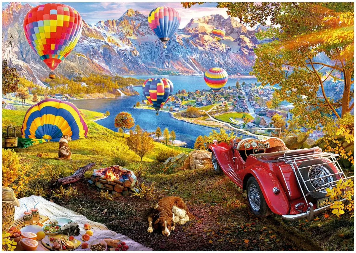 Himlen är klarblå och solen skiner denna "luftballongernas" dag. I en liten stad som ligger vid havet och bergen svävar färgglada luftballonger och någon har kört sin röda veteranbil upp på kullarna för att kunna njuta av den spektakulära utsikten. Hundarna är med och en härlig picknick är framdukad i gräset. Löven på marken skvallrar om att hösten är i antågande och en eld är tänd för att besökarna ska hålla värmen. Det ser verkligen ut att bli en härlig dag!