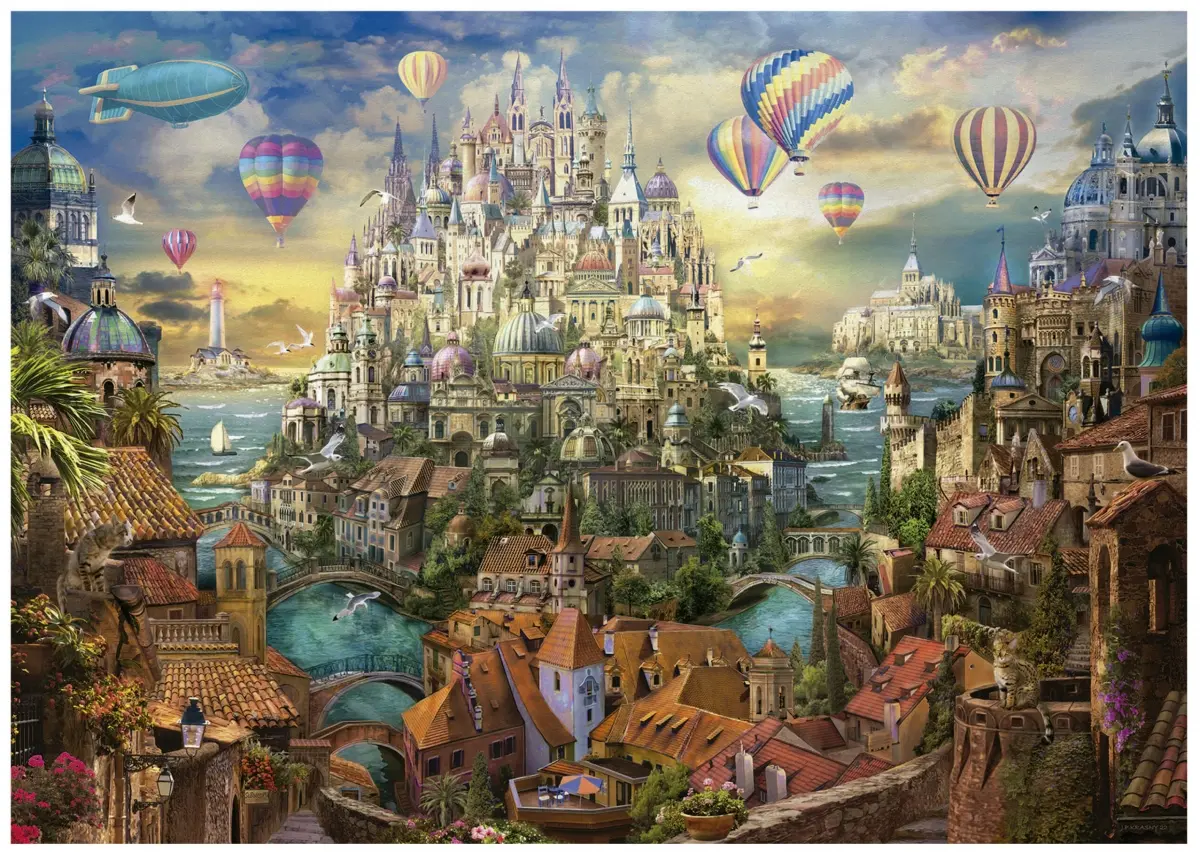 Här finns vackra tinnar och torn, floder som rinner ut i havet och fina stenbroar som knyter ihop stadsdelarna med varandra. På balkonger och hustak sitter katter och i himlen svävar fåglar bland färgglada luftballonger och en zeppelinare.